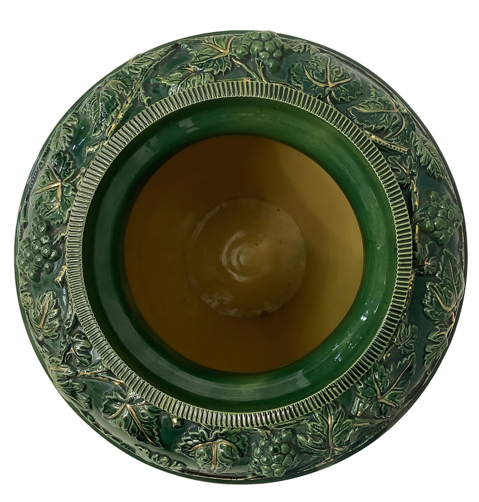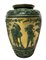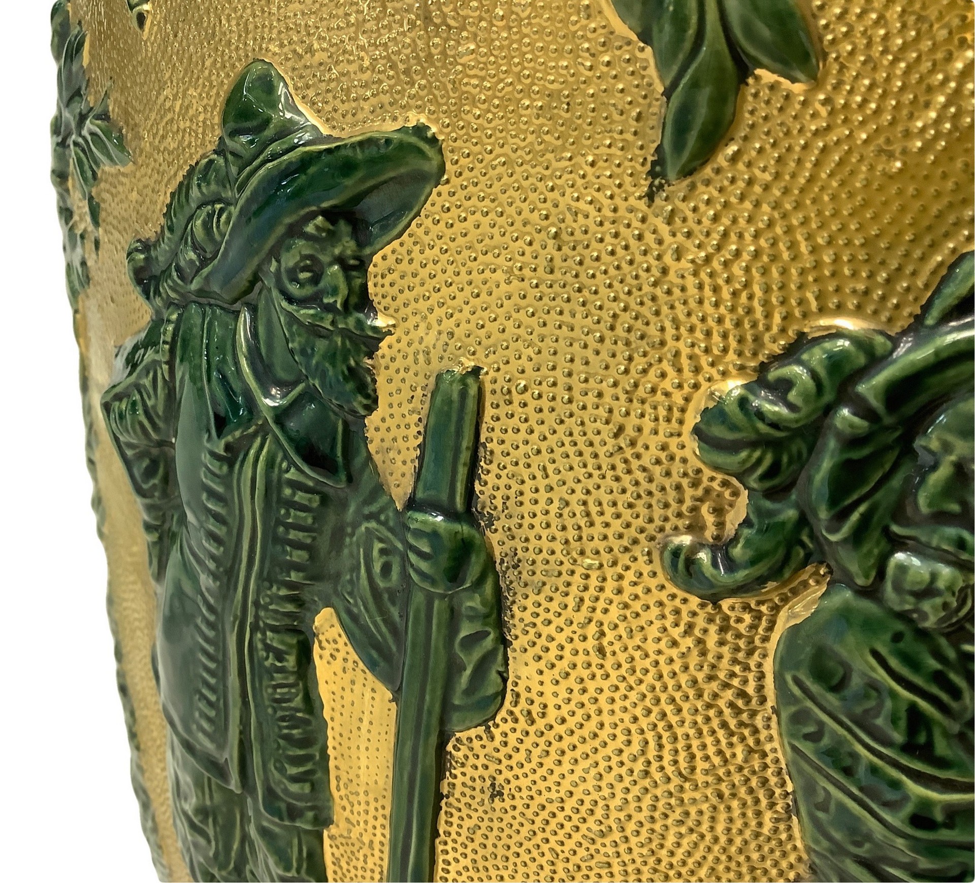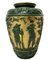 Vaso in maiolica verde e oro con raffigurazione di tralci d'uva e personaggi, 20° secolo
