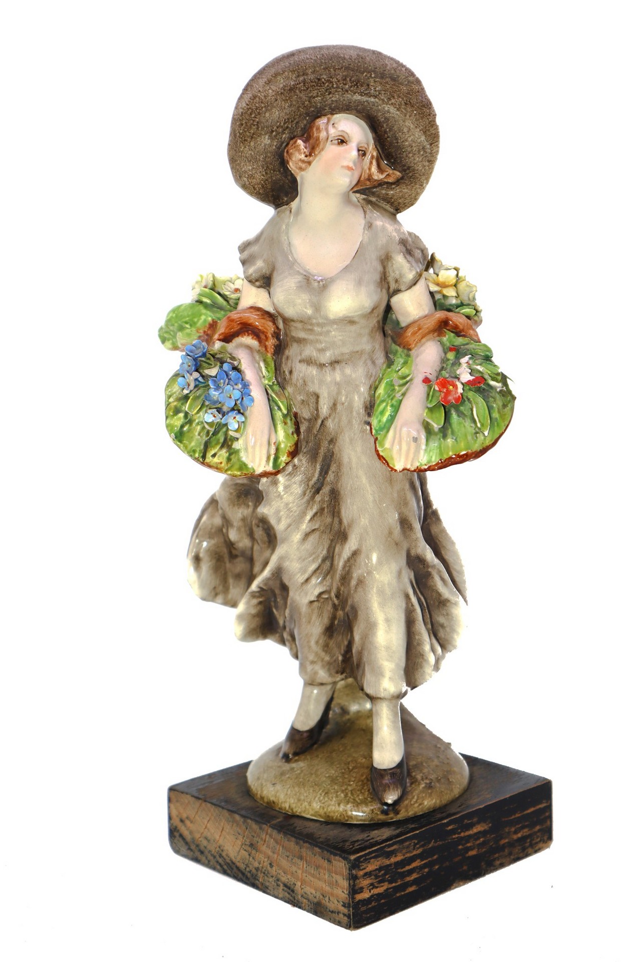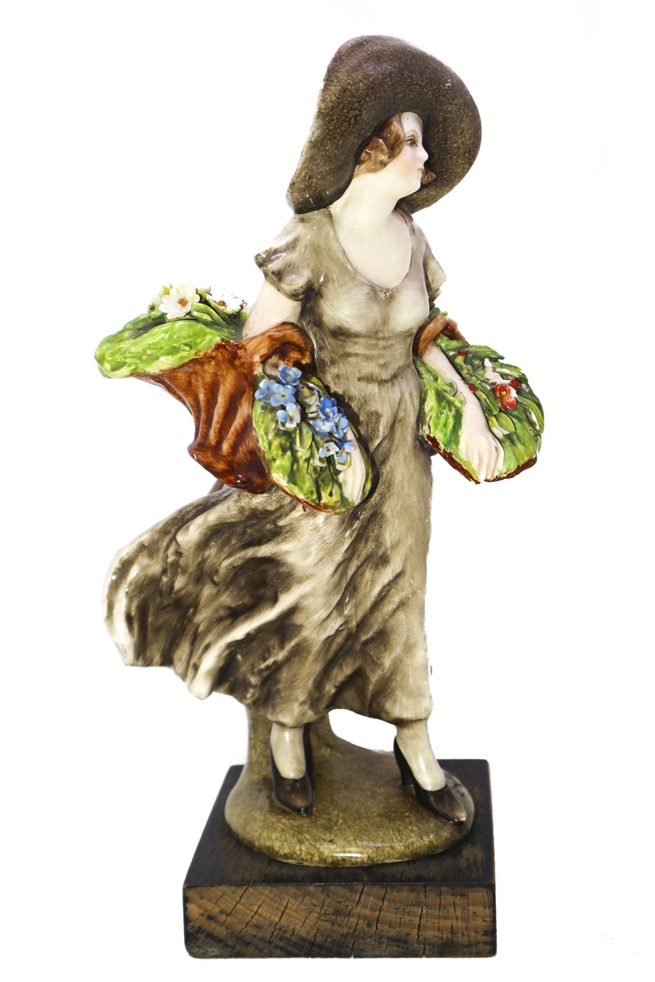 Statuina in ceramica raffigurante dama con cesto di fiori H cm 20 In ceramica policroma. Marchio alla base inciso "P,604". Presenti minime mancanze.