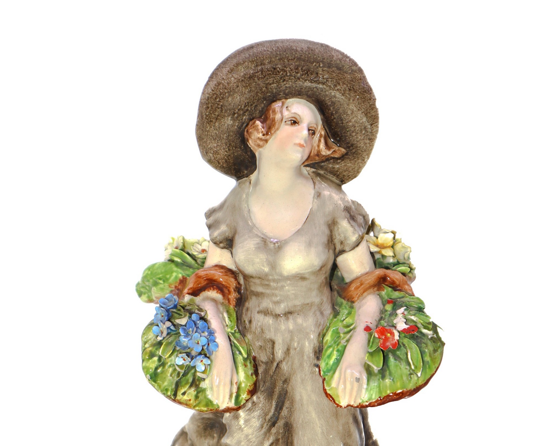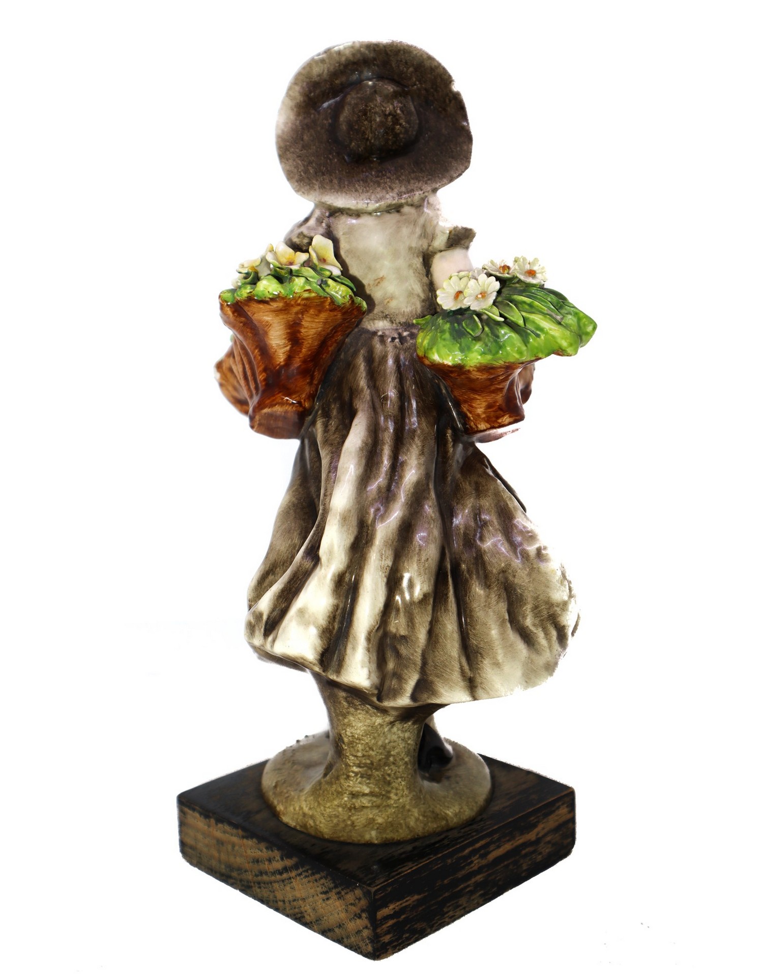 Statuina in ceramica raffigurante dama con cesto di fiori