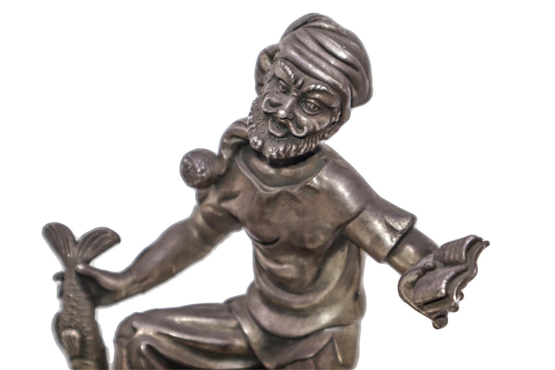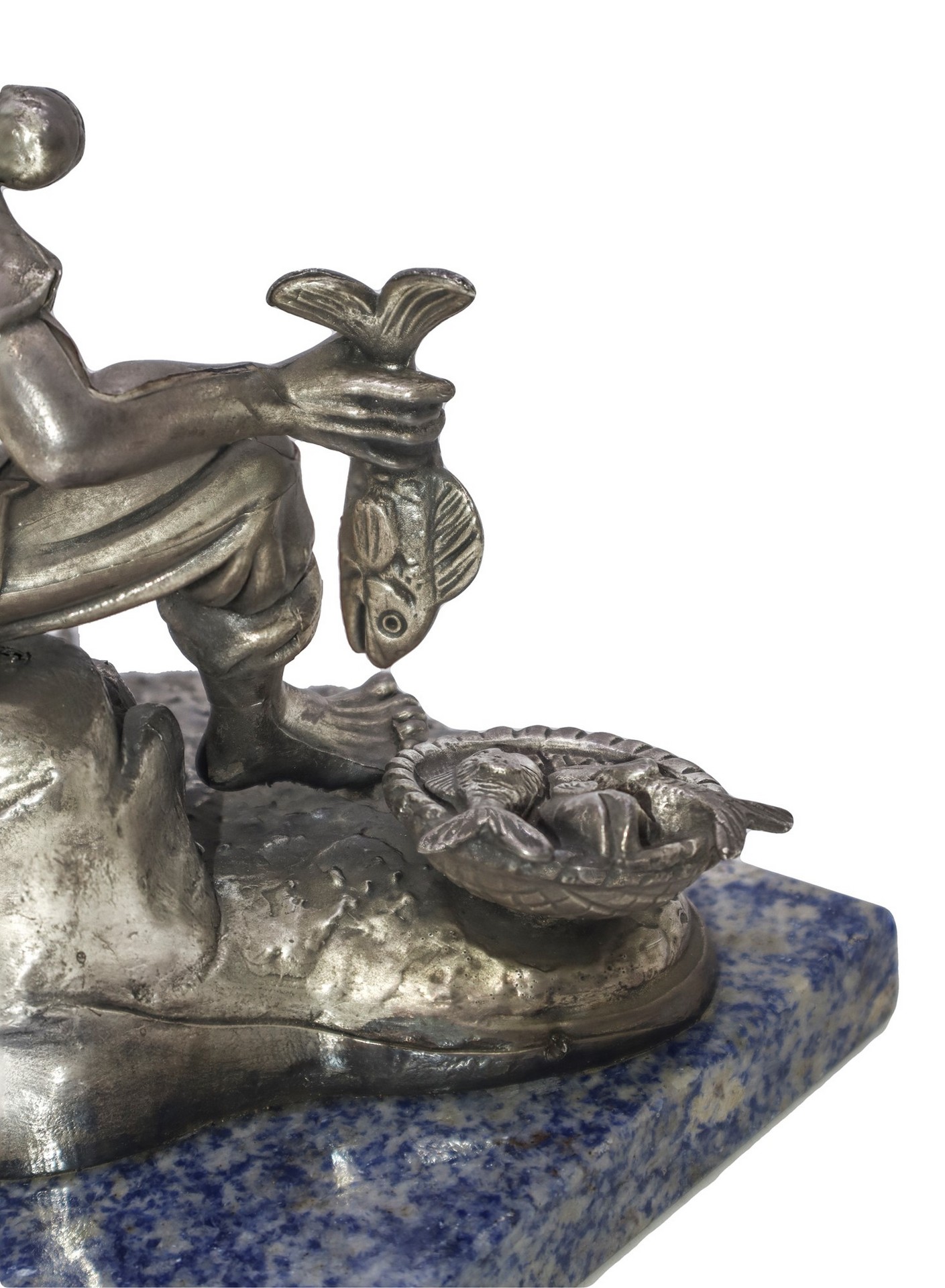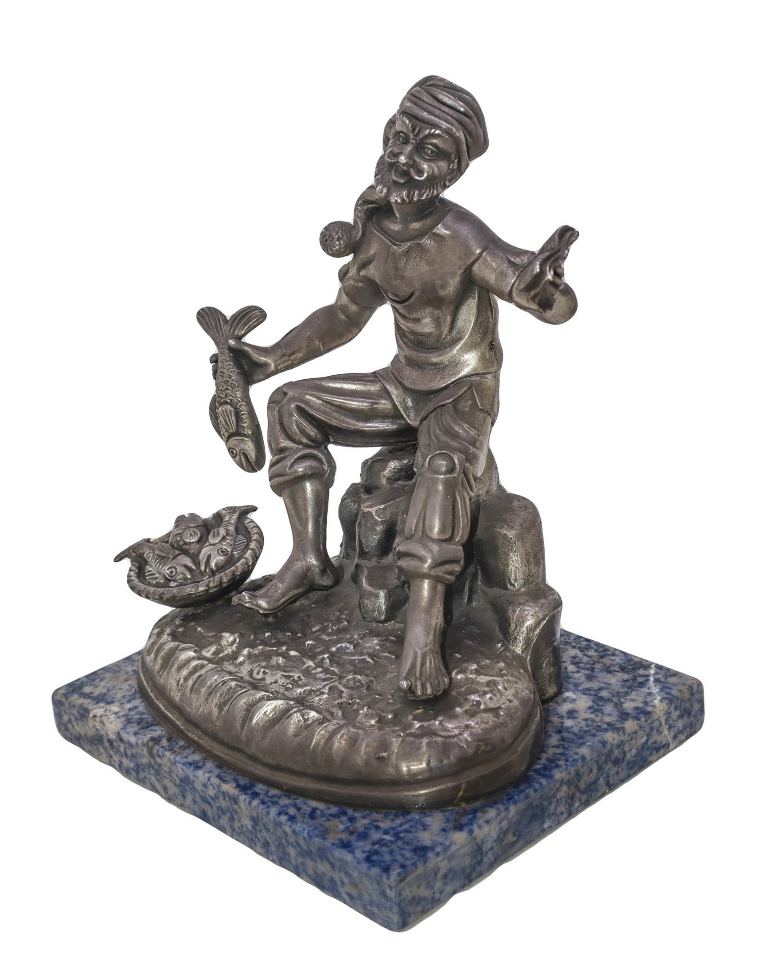 Pescatore H cm 21, base cm 17 x cm 14 Scultura ricoperta in lamina d'argento, con base in marmo.