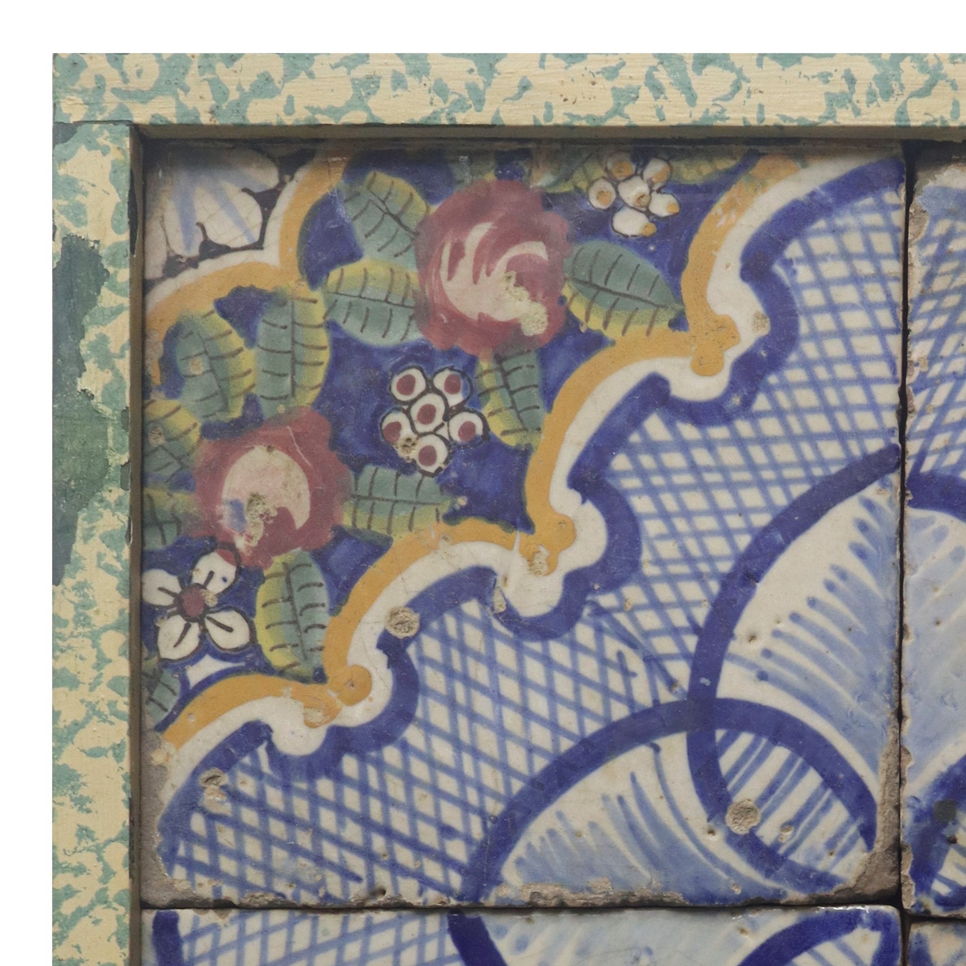 N.4 Composizione di n.4 mattonelle in maiolica di Caltagirone, Fine 19° secolo cm 20 x cm 20 cad. In corniceIn cornice