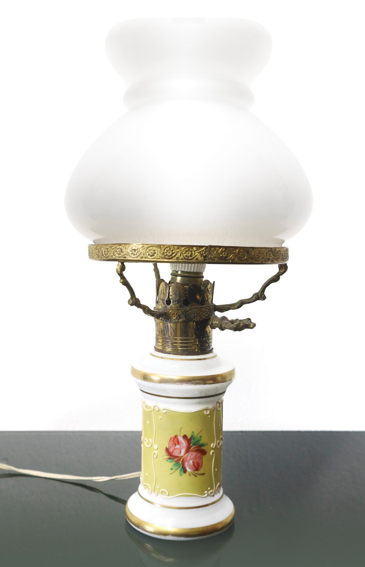 Piccolo lume con base in porcellana e coppa in opaline, c