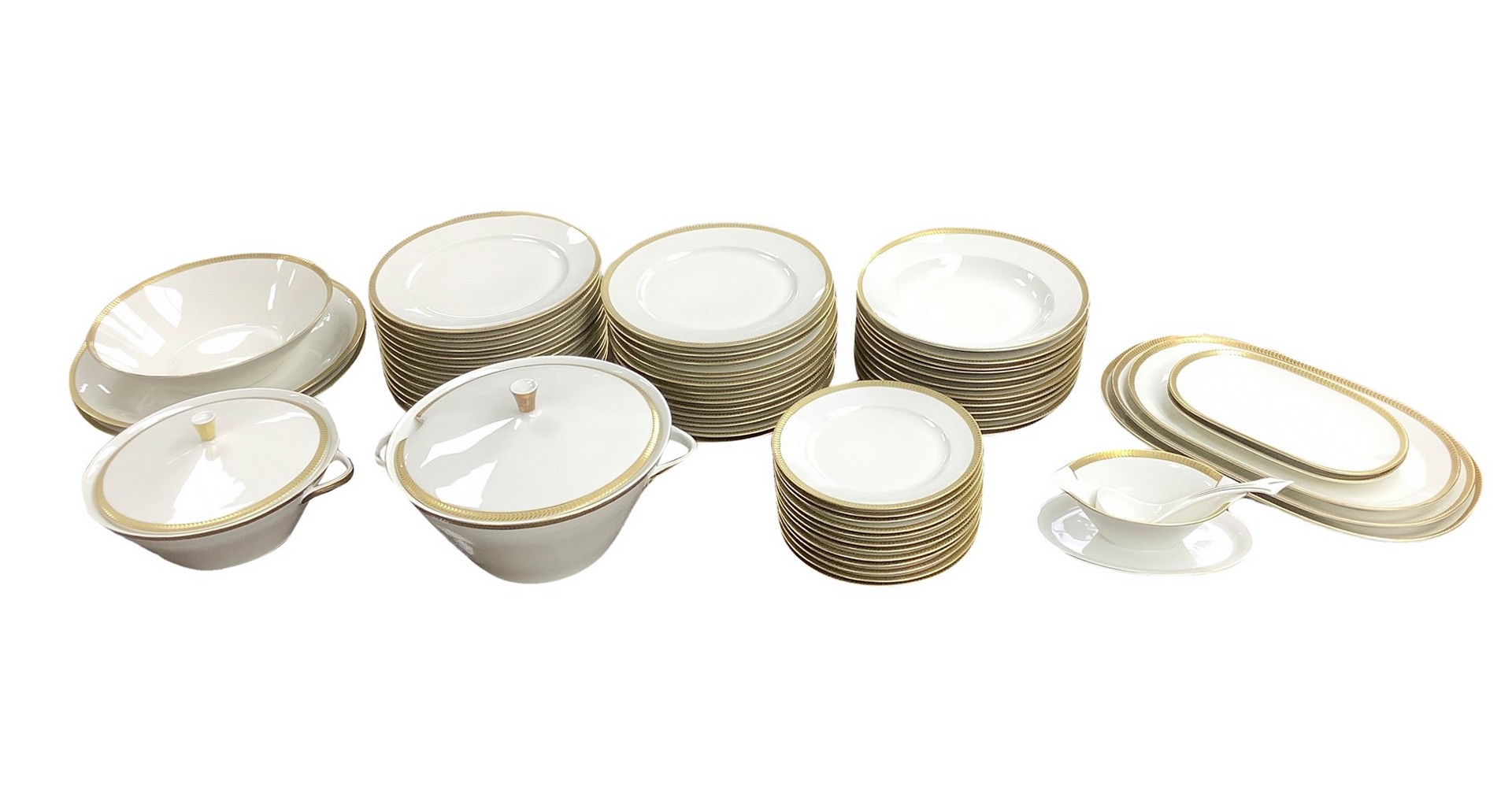 Bavaria Johann Seltmann Vohenstrauss - Servizio porcellana “Bavaria Johann Seltmann Vohenstrauss” Porcellana Con bordi in oro. Composto da 24 piatti piani, 12 piatti fondi (di cui 1 con bordo sbeccato), 12 piatti dessert, 1 zuppiera media, 1 zuppiera grande, 1 salsiera con cucchiaio, 1 insalatiera, 7 piatti da portata