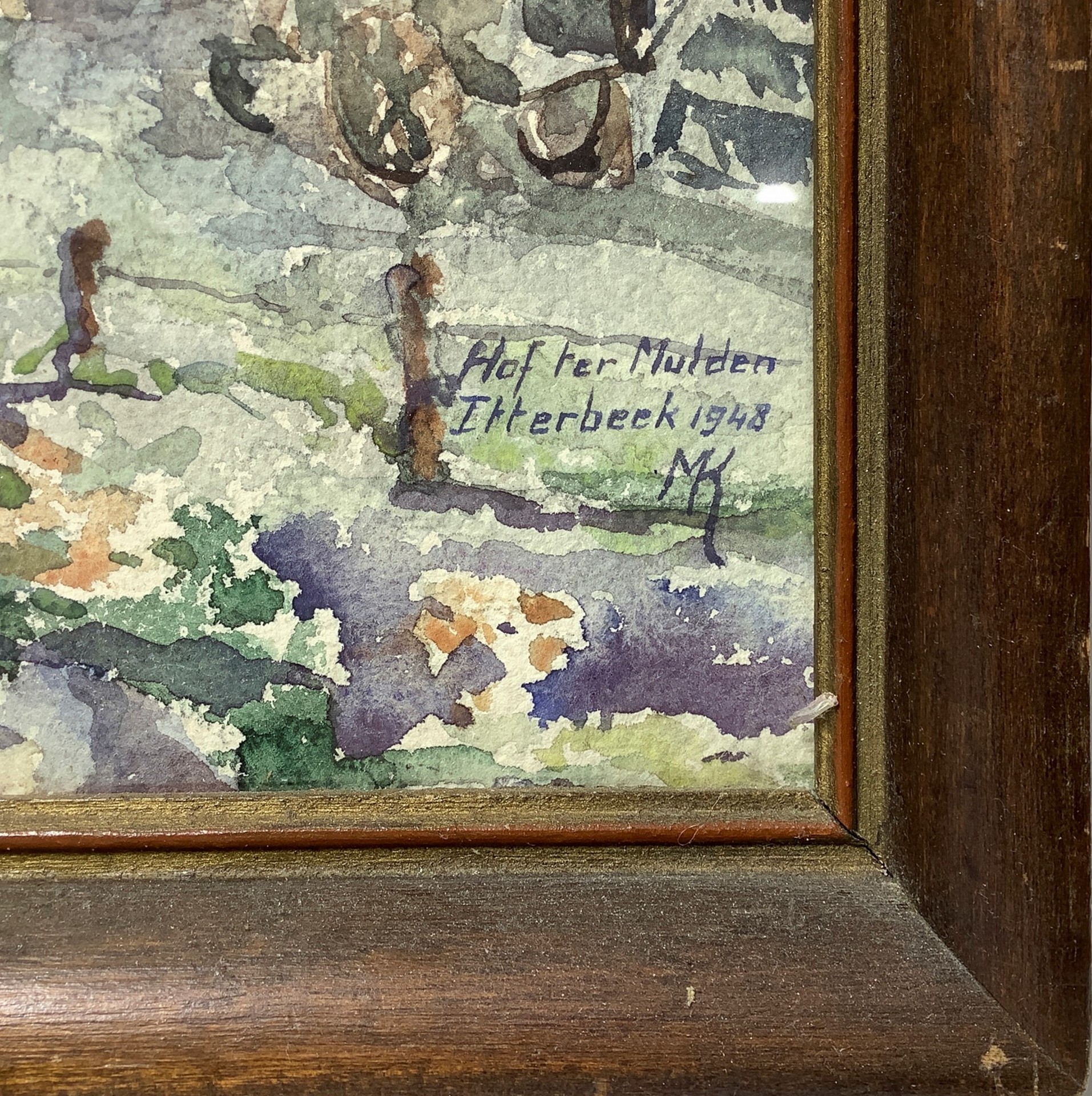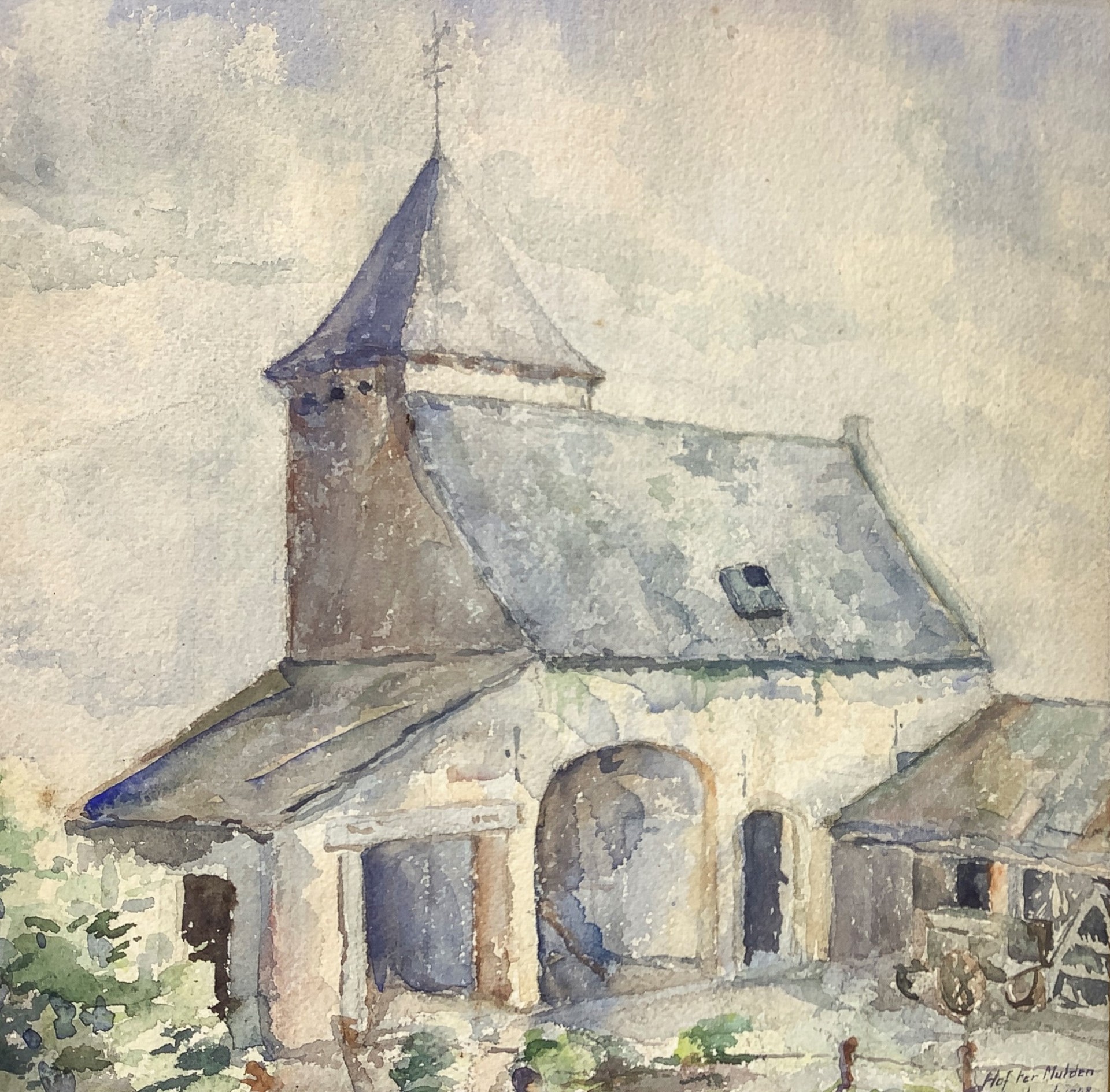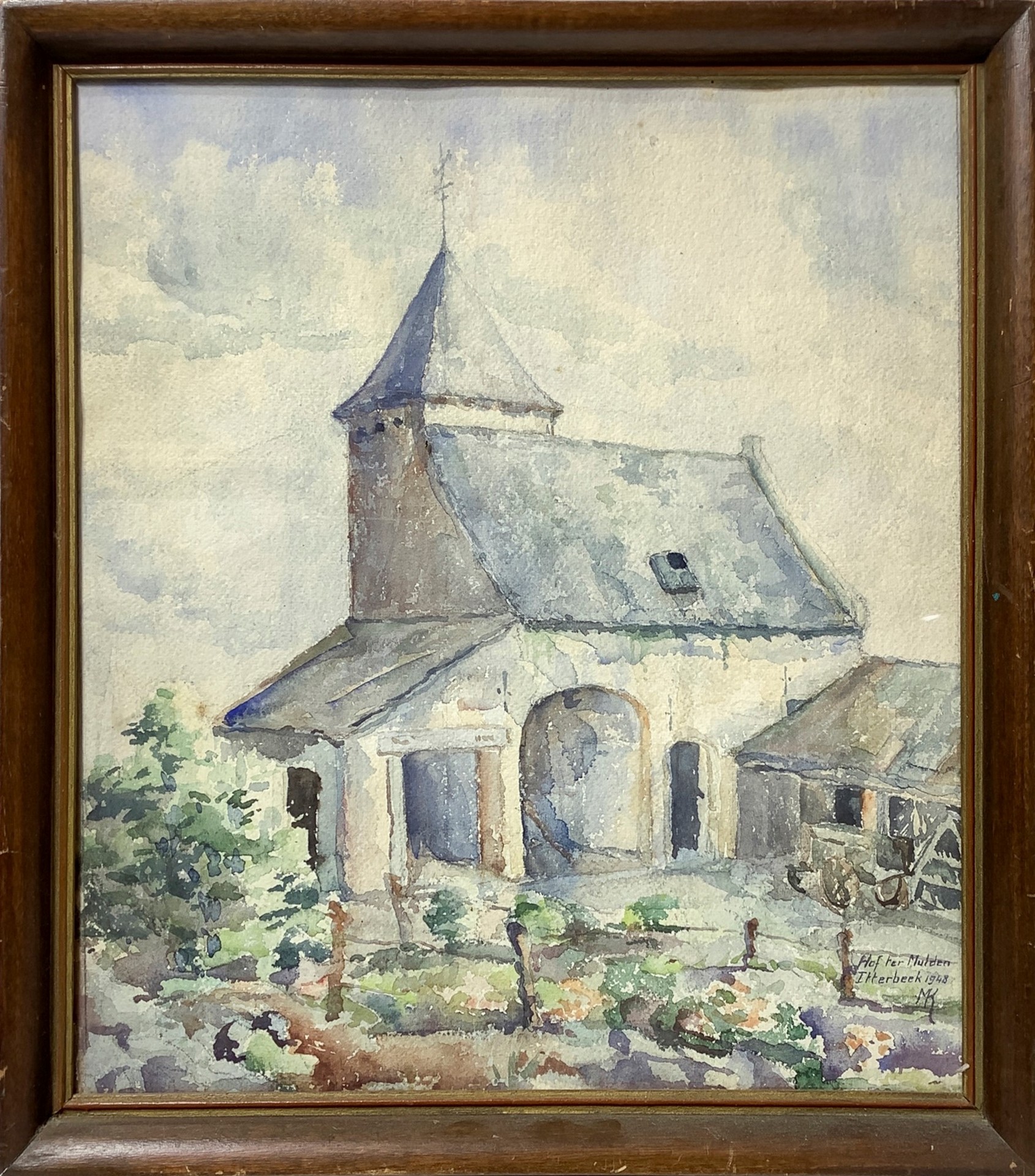 Hof Ter Mulden (Itterbeek 1948) - Acquarello su carta in cornice raffigurante paesaggio di campagna con case,