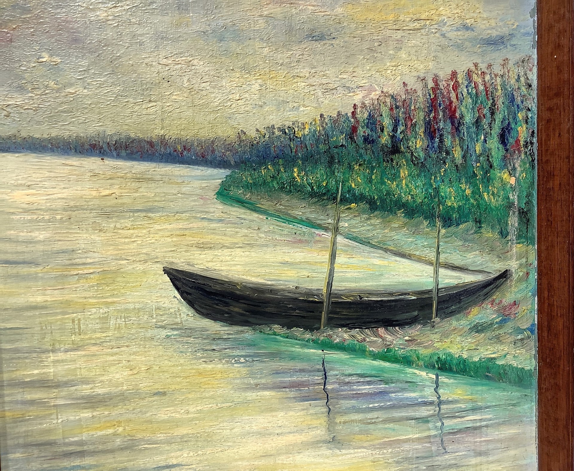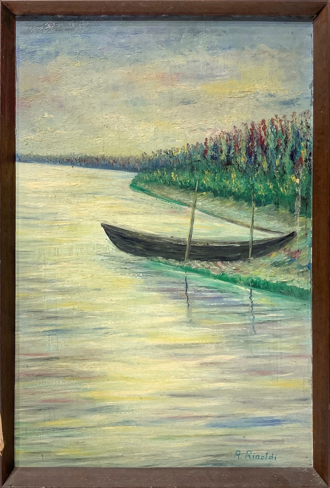 Paesaggio con barca Cm 33x51, in cornice cm 34,5x52,5 Olio su tavola firmato in basso a destra A. Rinoldi.