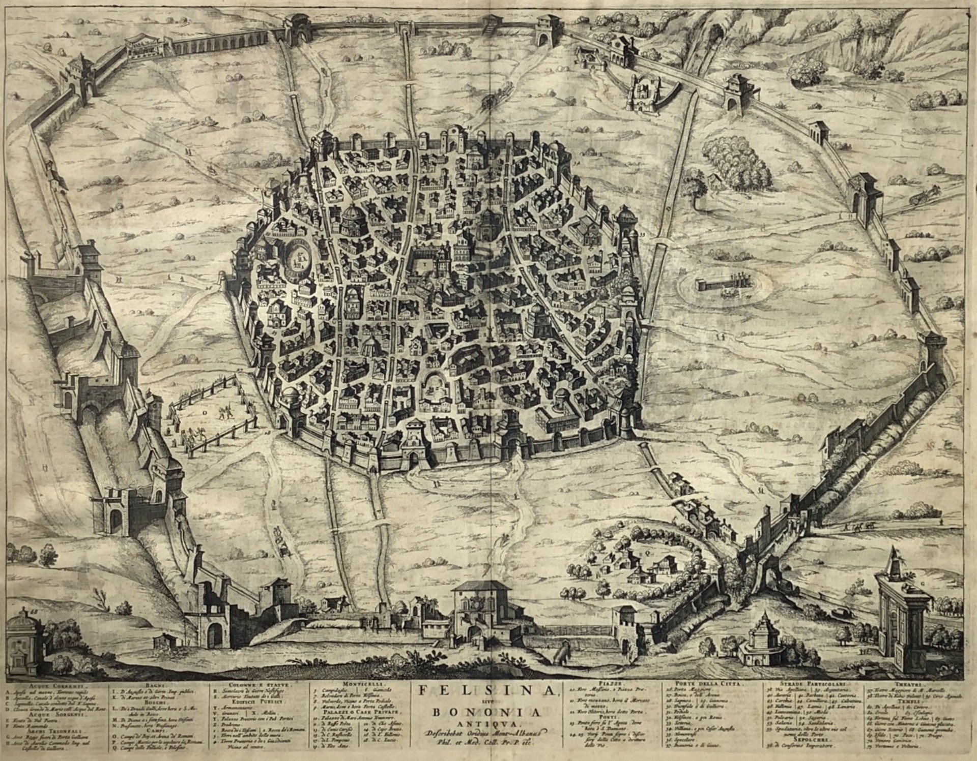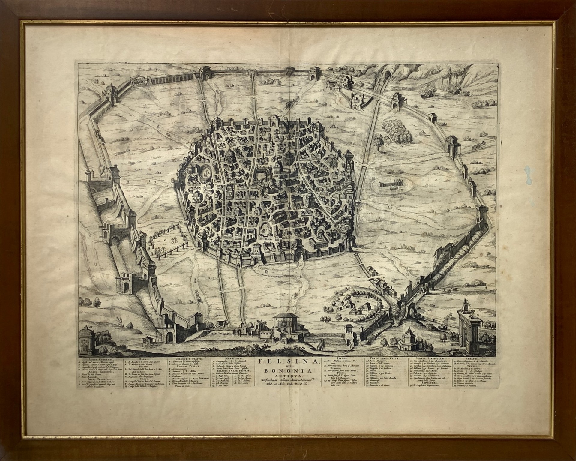 Felsina sive Bononia antiqua Mm 500x640, in cornice cm 56x70 Incisione ad acquaforte Joam Blaeu (1596-1673) pubblicata Am 1704, ed. Pieter Mortier.