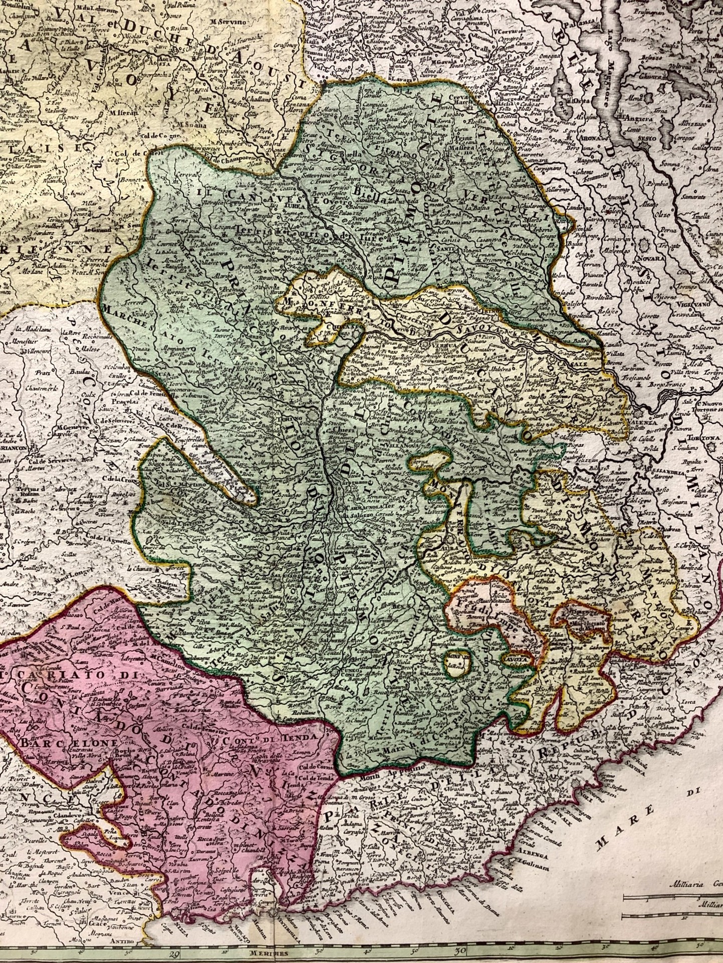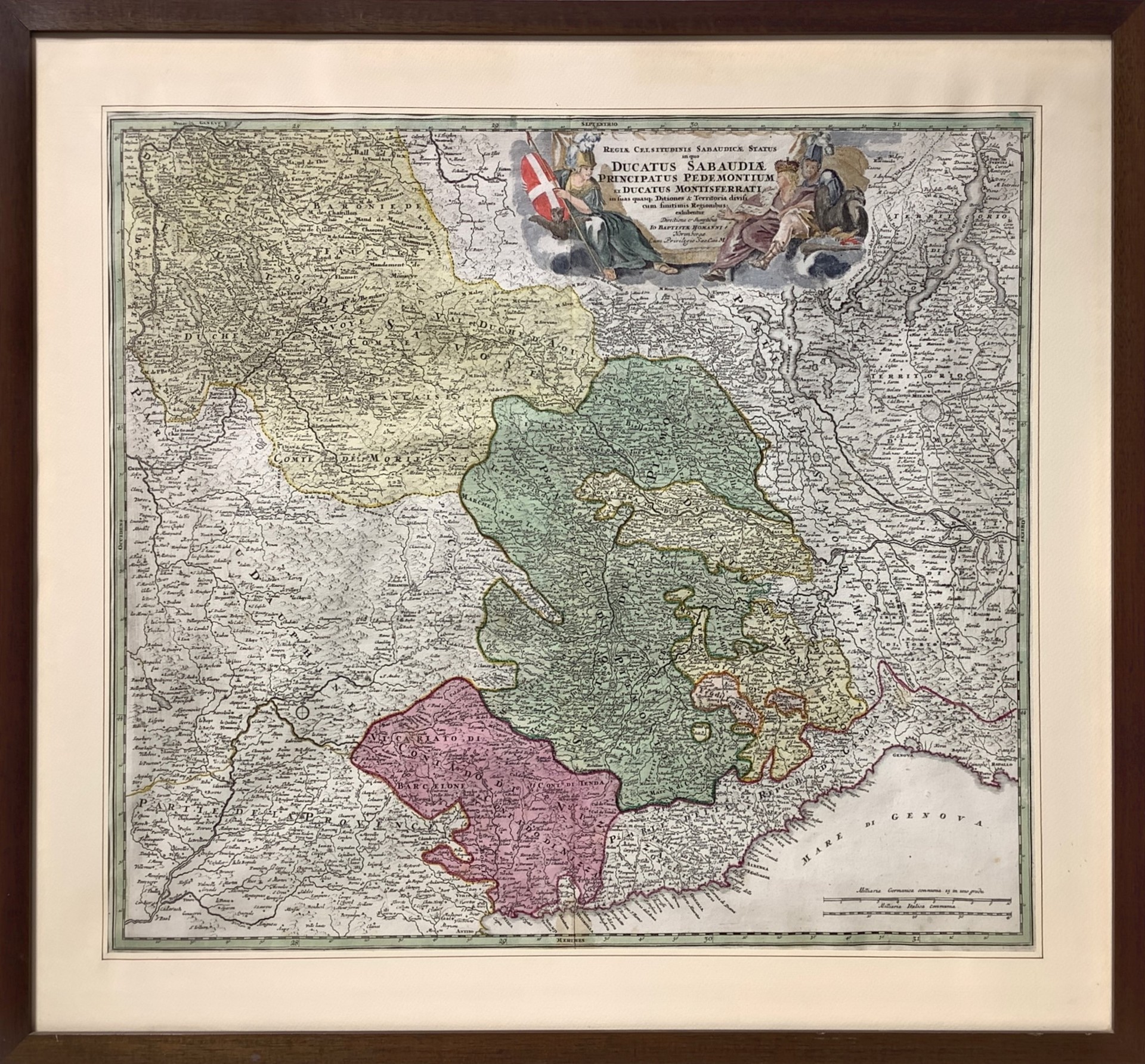 Ducatus Sabaudiae Principatus Pedemontium et Ducatus Montisferratis Mm 490x560, in cornice cm 63x70. incisione acquarellata C. Weigel (Germania 1712). Ed Joahnn Vaptist Homann (Norimberga 1716).