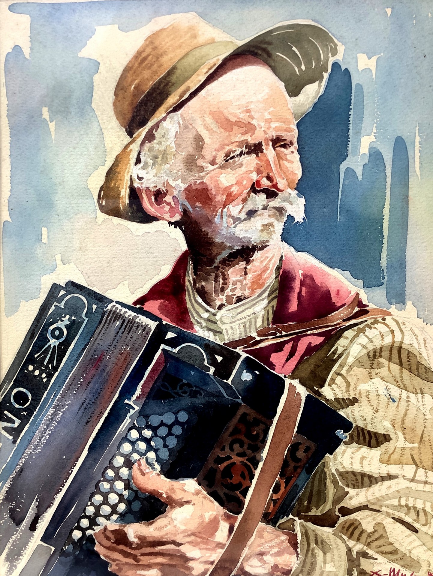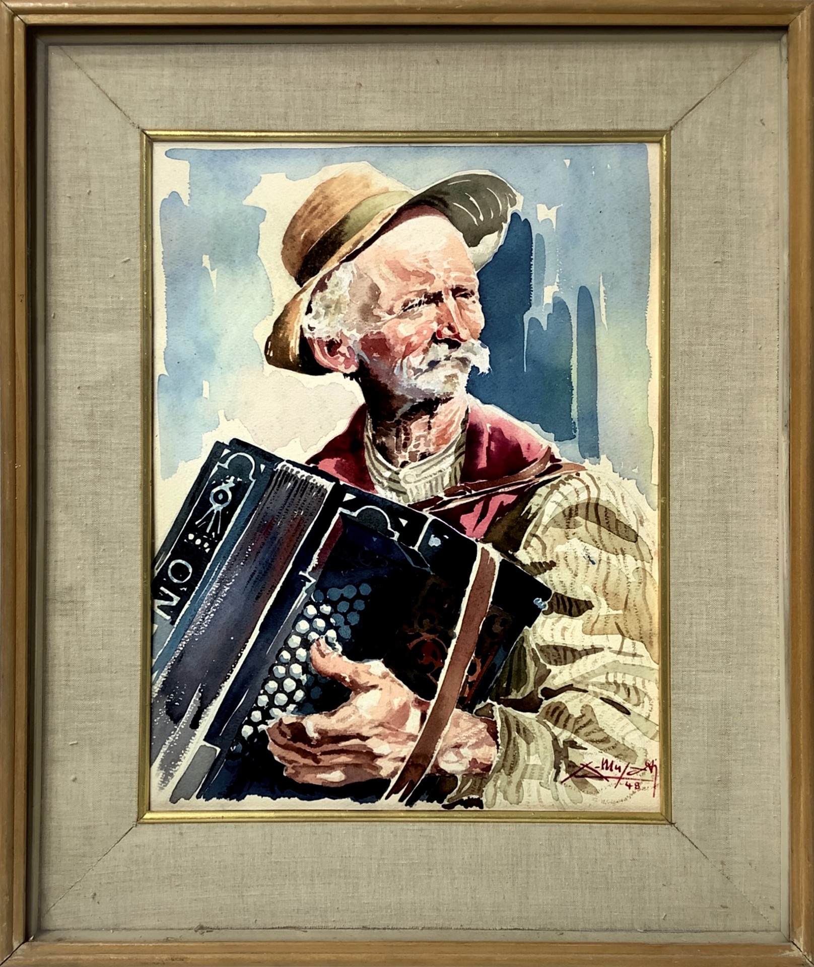Suonatore di fisarmonica Mm 440x335in cornice cm 61x50 acquarello su carta Firmato in basso a destra e datato ‘48.