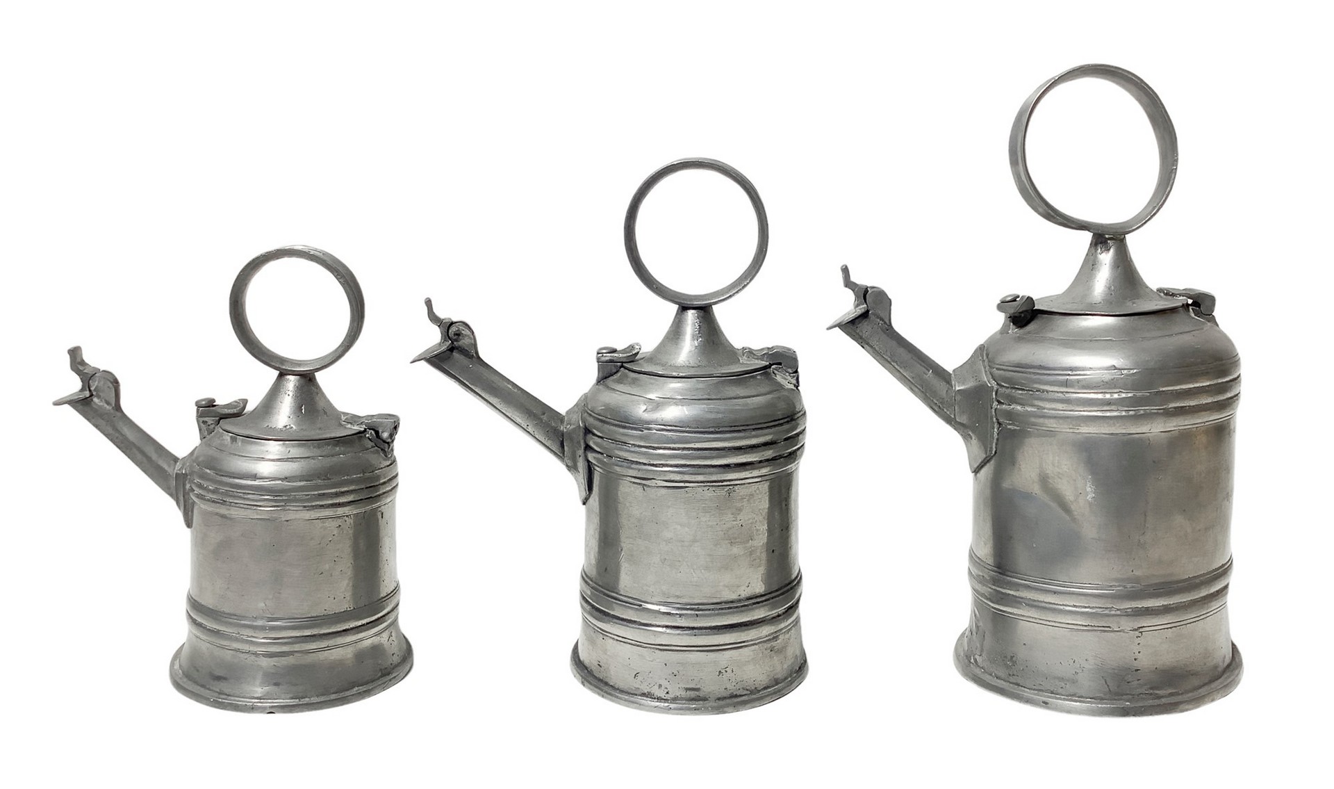Trittico di antichi versatoi in peltro massiccio 95, nineteen° secolo