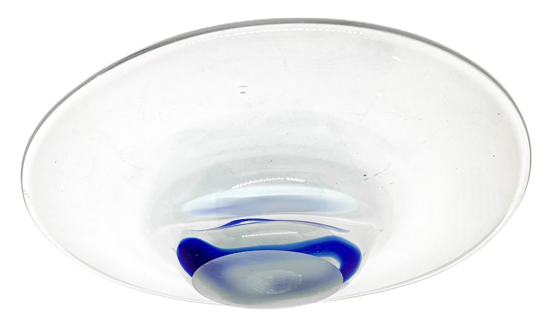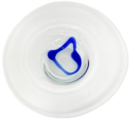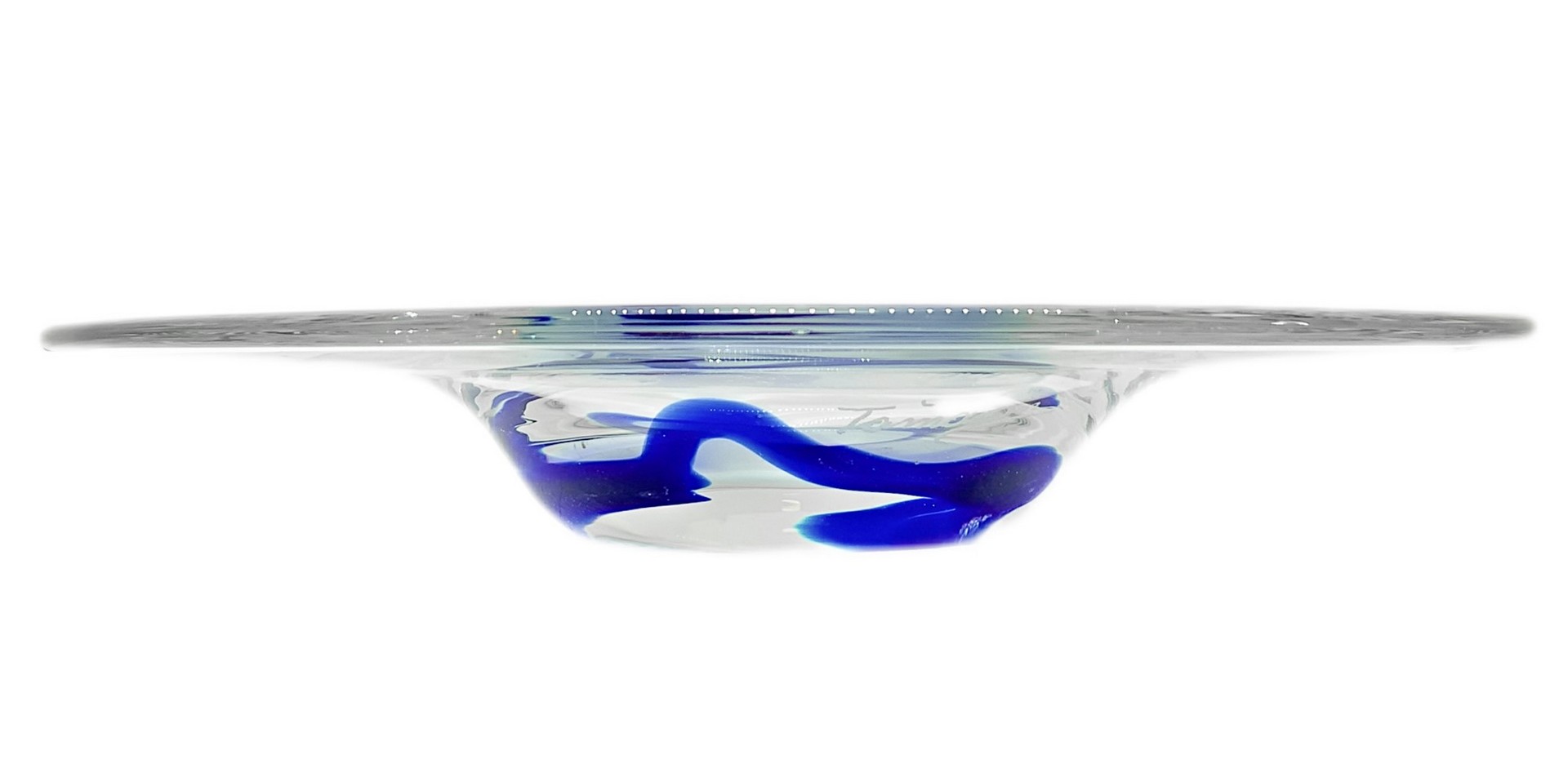 Piccolo centrotavola in vetro di Murano con striature nei toni del blu, Ioan Tamaian, 20° secolo. Diametro cm 23,5 Firmato Tamaian.Firmato Tamaian.