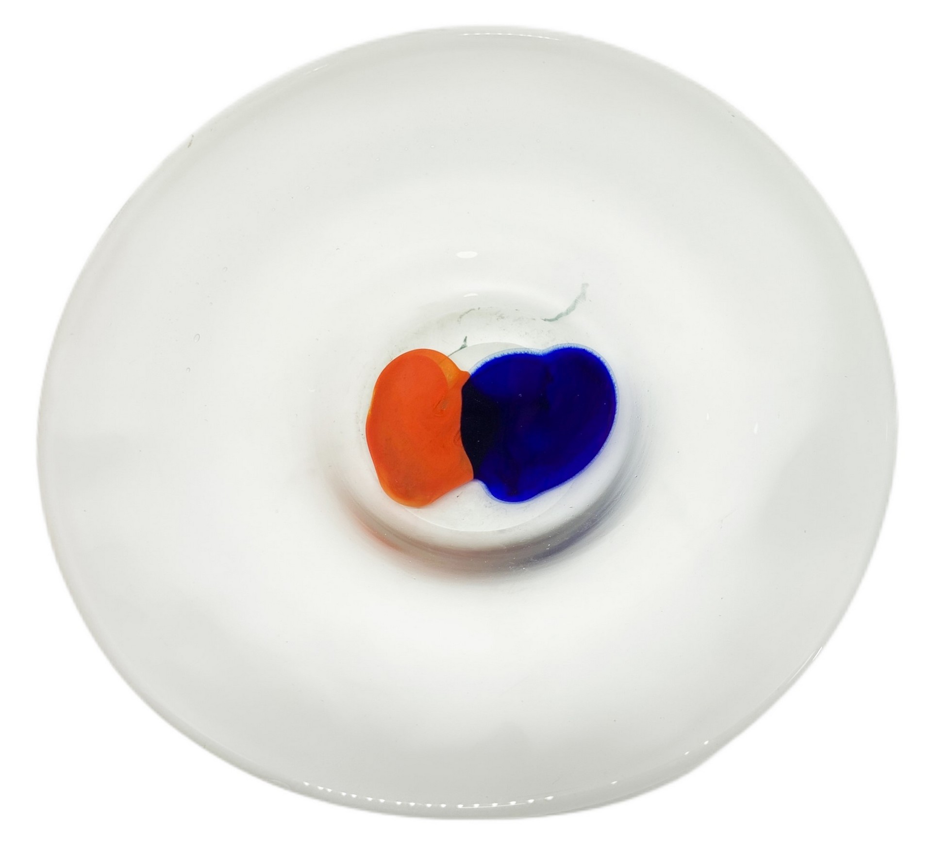 Piccolo centrotavola in vetro di Murano con striature nei toni del blu e centro marrone, Ioan Tamaia Diametro cm 23,5 Romania, XX secolo. Firmato Tomaian.Romania, XX secolo. Firmato Tomaian.
