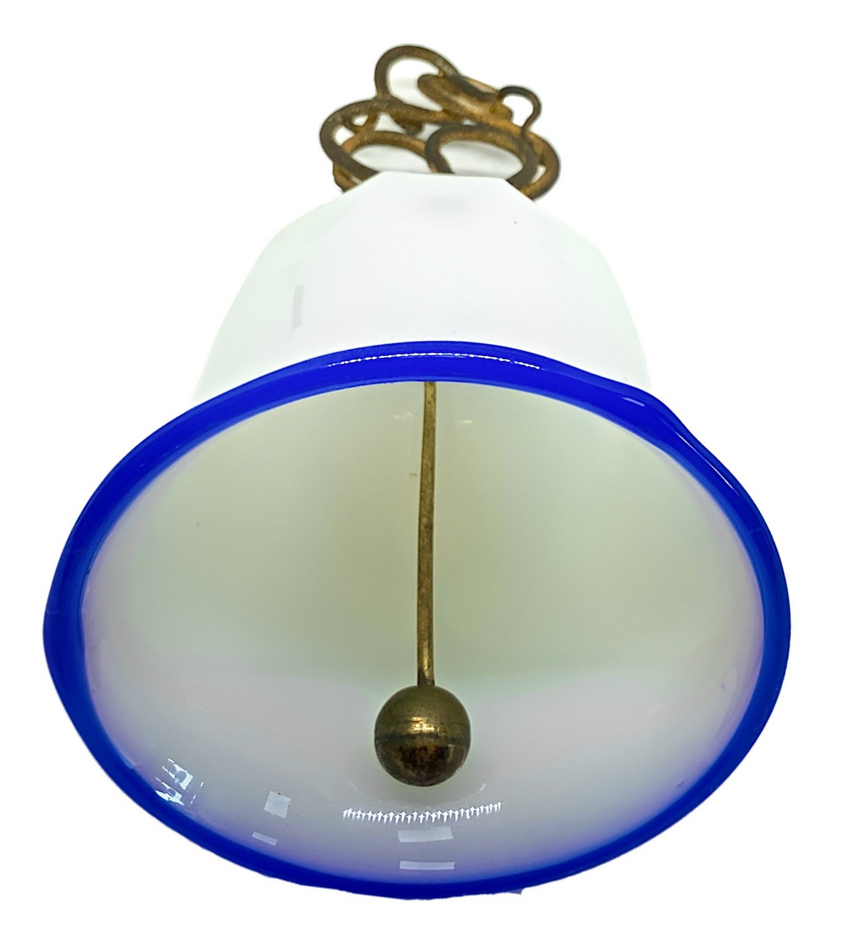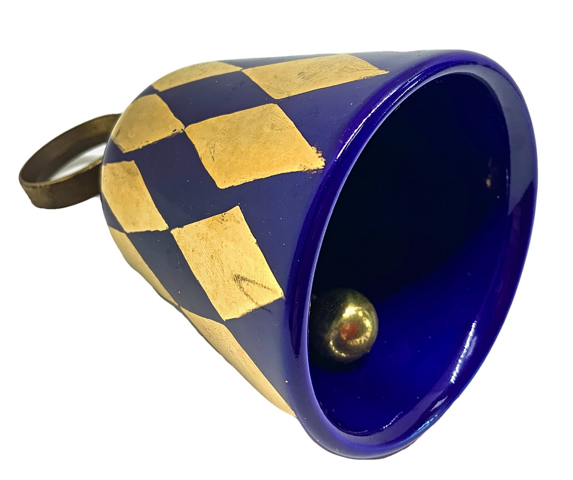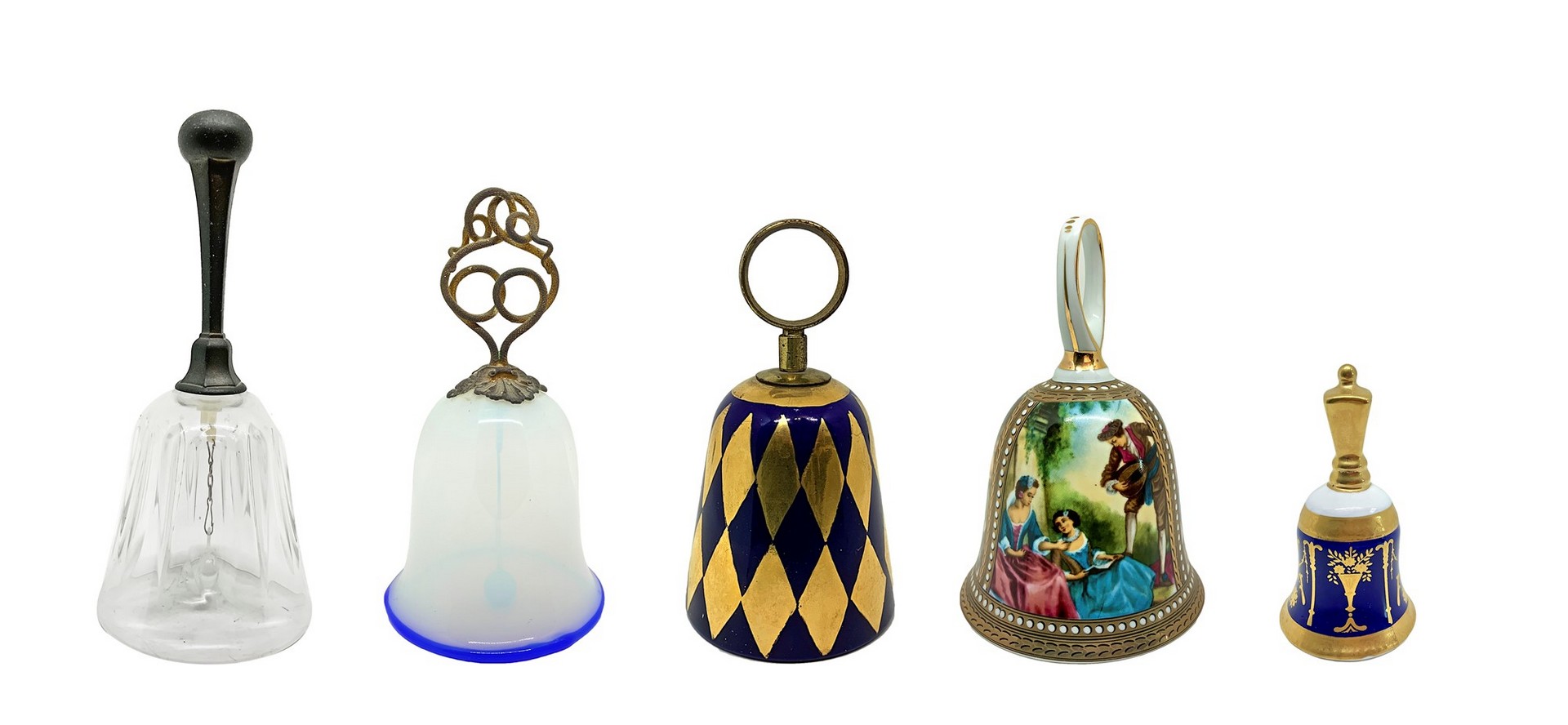 Gruppo di n. 5 campanelle. 1) H cm 15; 2) cm 14; 3) cm 12 4) cm 13 5) cm 8 Una in cristallo, una in vetro lattimo e presa in ottone. Una in porcellana raffigurante scene di genere. Una in ceramica con rombi dorati e blu. Una blu e oro con decorazioni floreali, XX secolo.Una in cristallo, una in vetro lattimo e presa in ottone. Una in porcellana raffigurante scene di genere. Una in ceramica con rombi dorati e blu. Una blu e oro con decorazioni floreali, XX secolo.