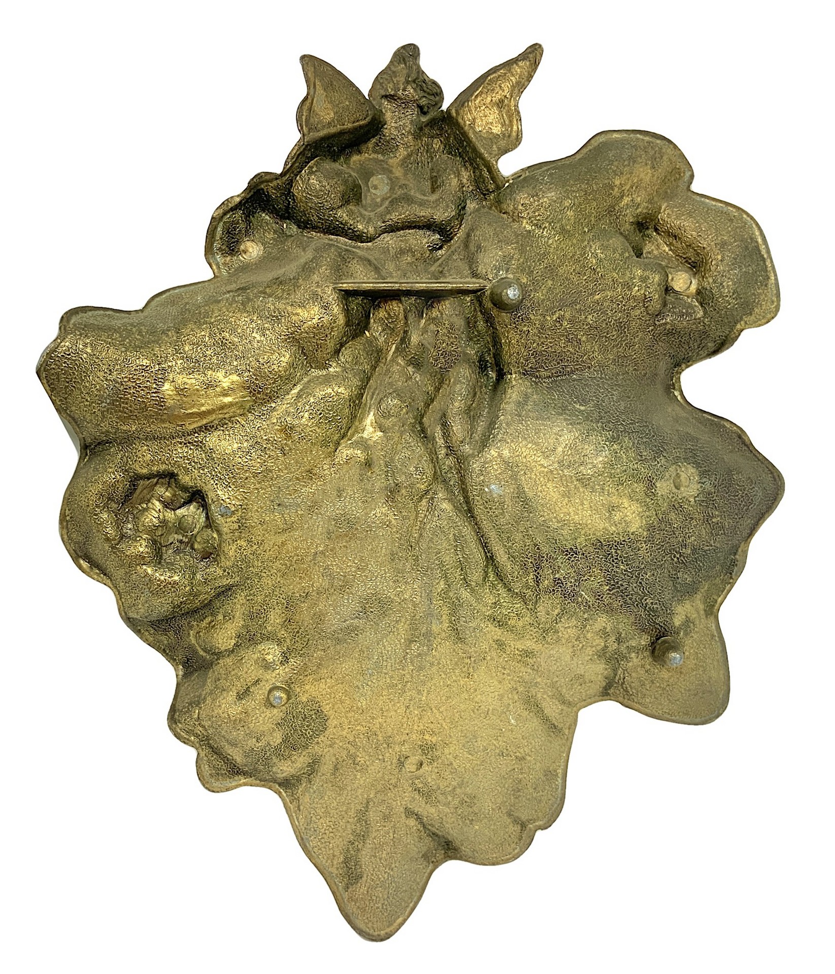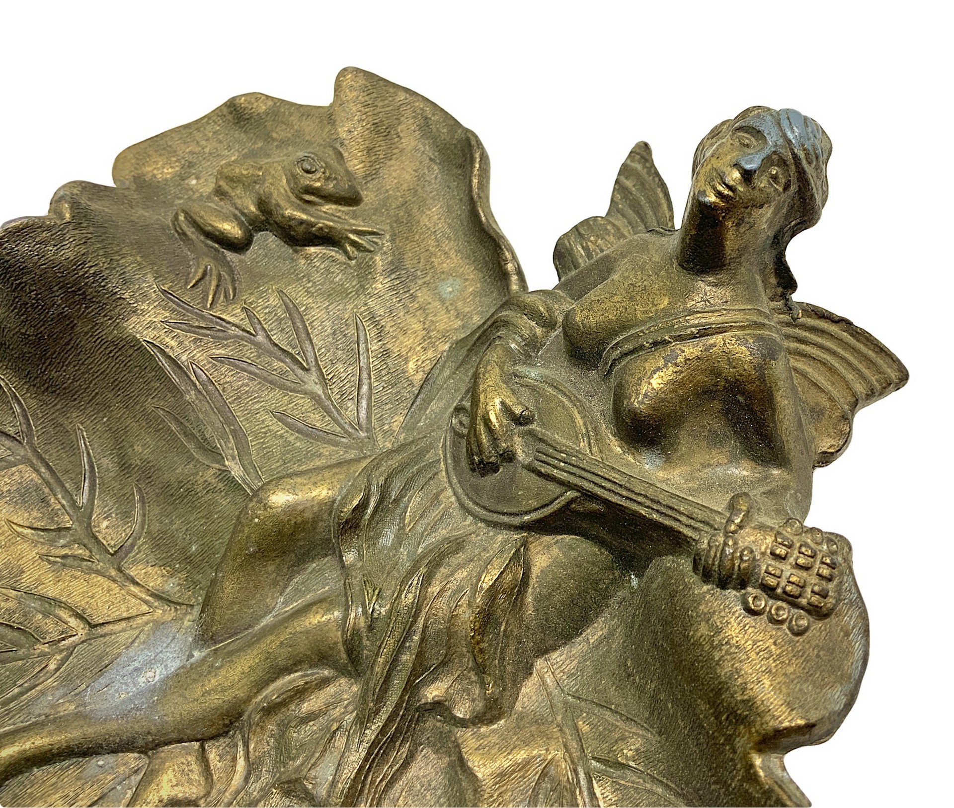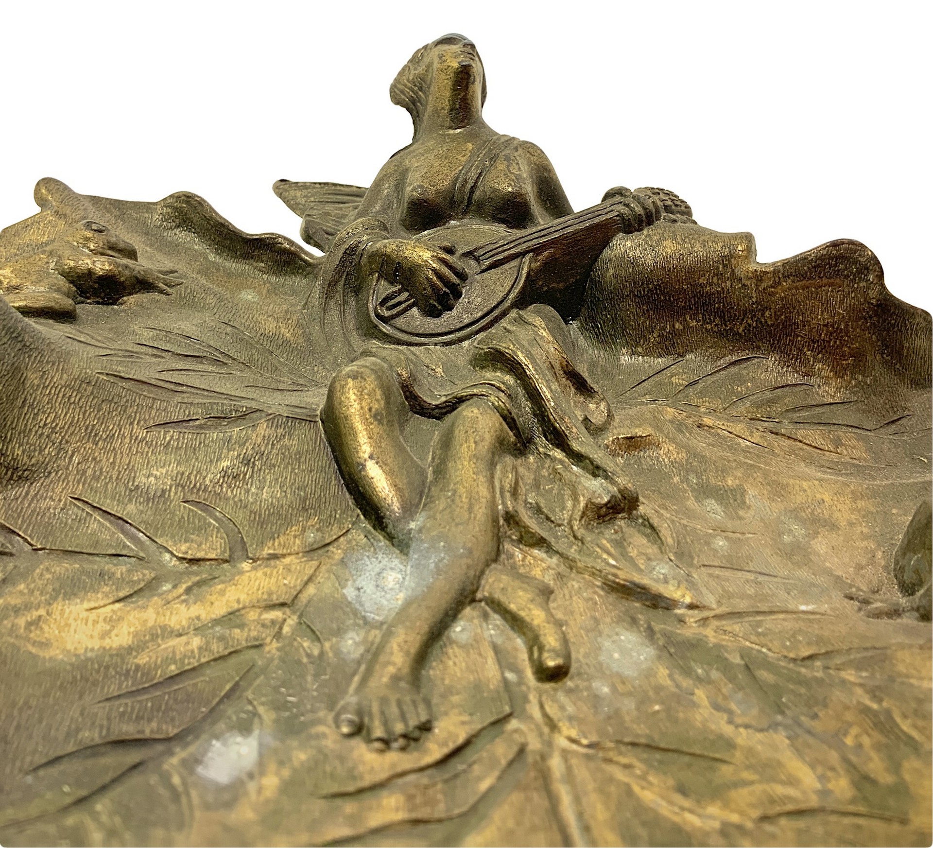 Svuotatasche in zama dorata raffigurante foglia con donna che suona, 20° secolo Cm 25