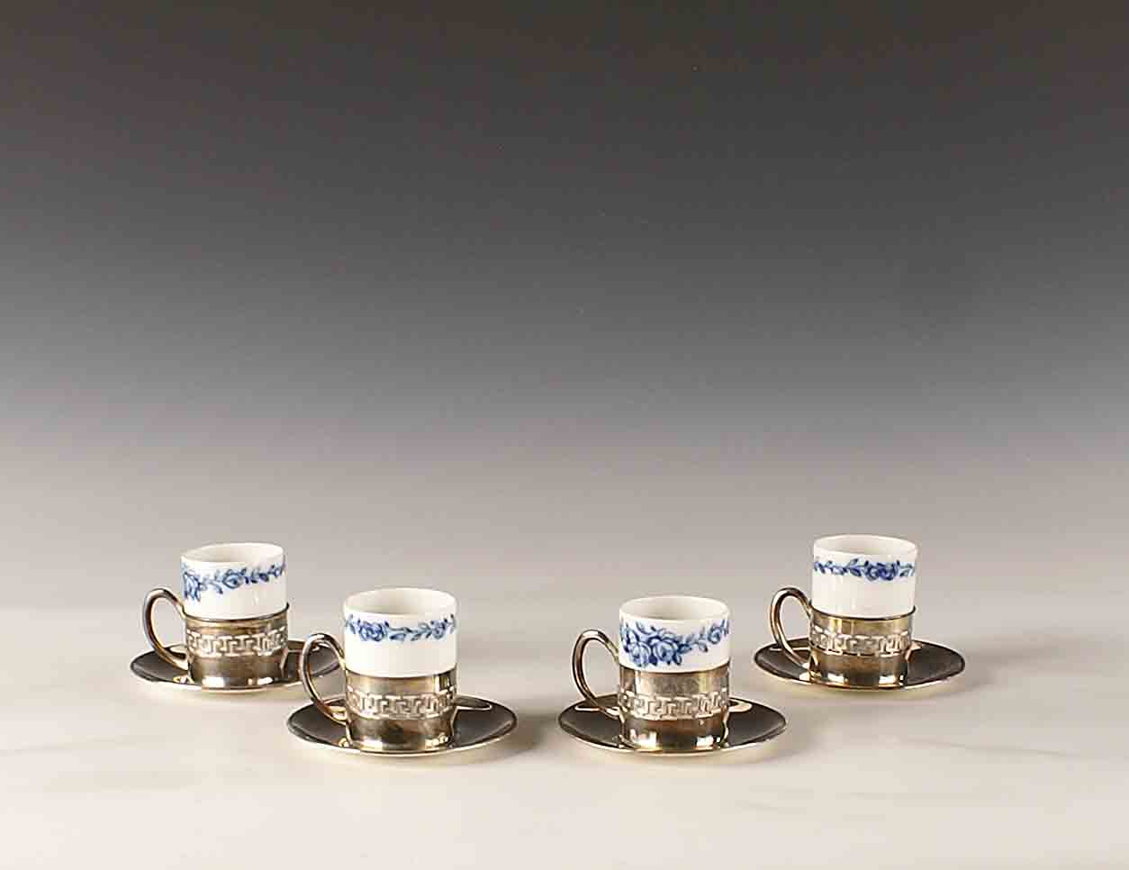 Sei tazzine da caffè in porcellana e argento con relativi piattini in argento, vecchia manifattura, gr. 240.