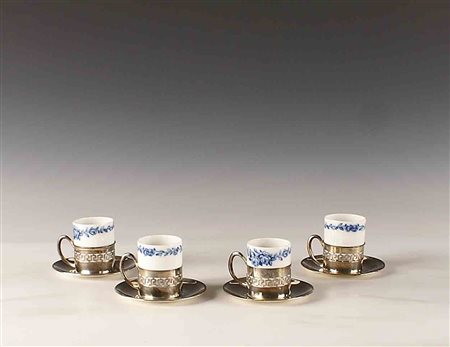 Sei tazzine da caffè in porcellana e argento con relativi piattini in...