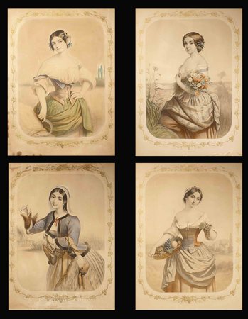 Scuola francese della fine del XIX secolo, "Allegoria delle Stagioni", quattro stampe, cm. 52x38.