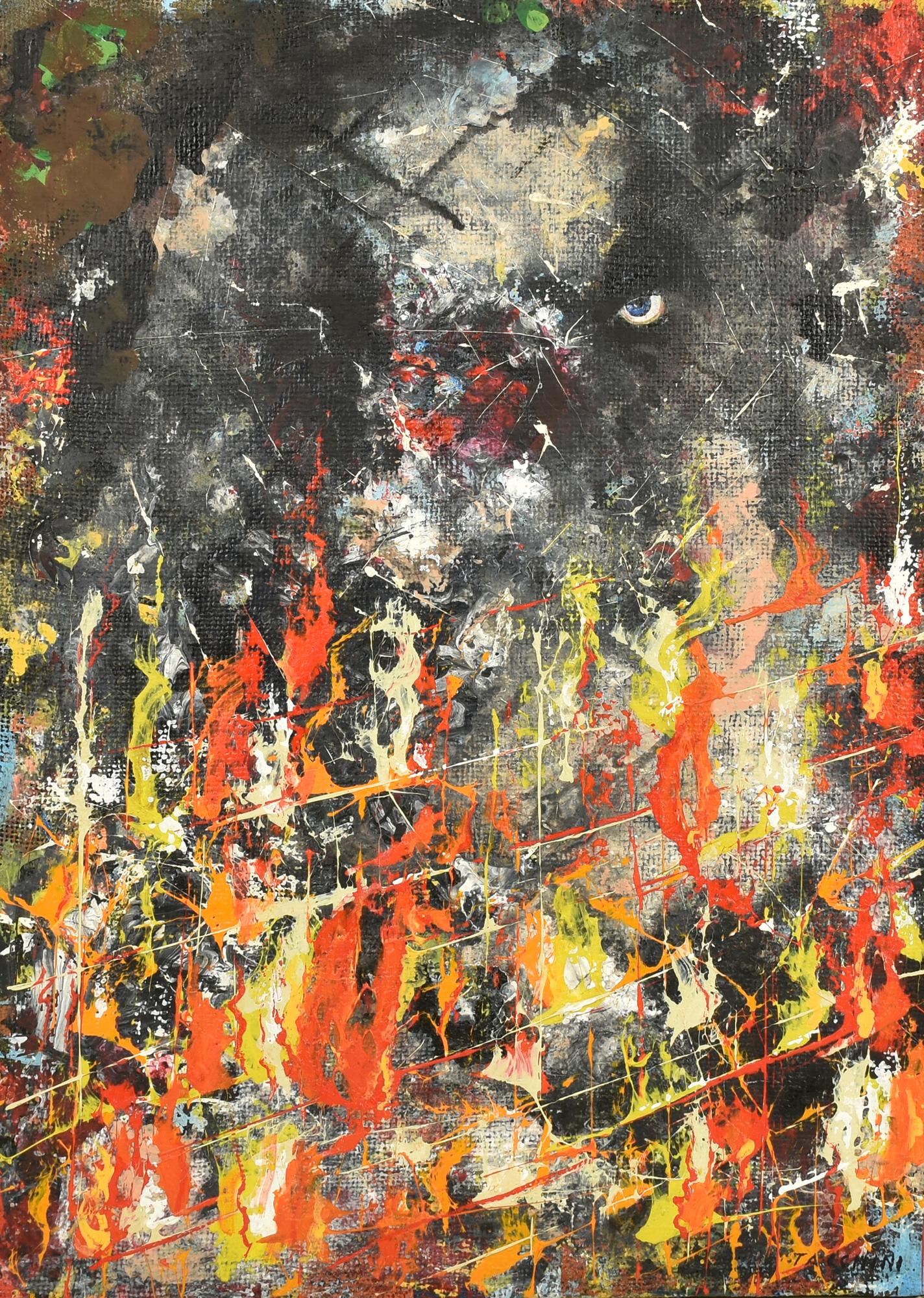 Carlo Tacchini PIROMANI IN LIBERTA' acrilico su tela di juta, cm 70x50...