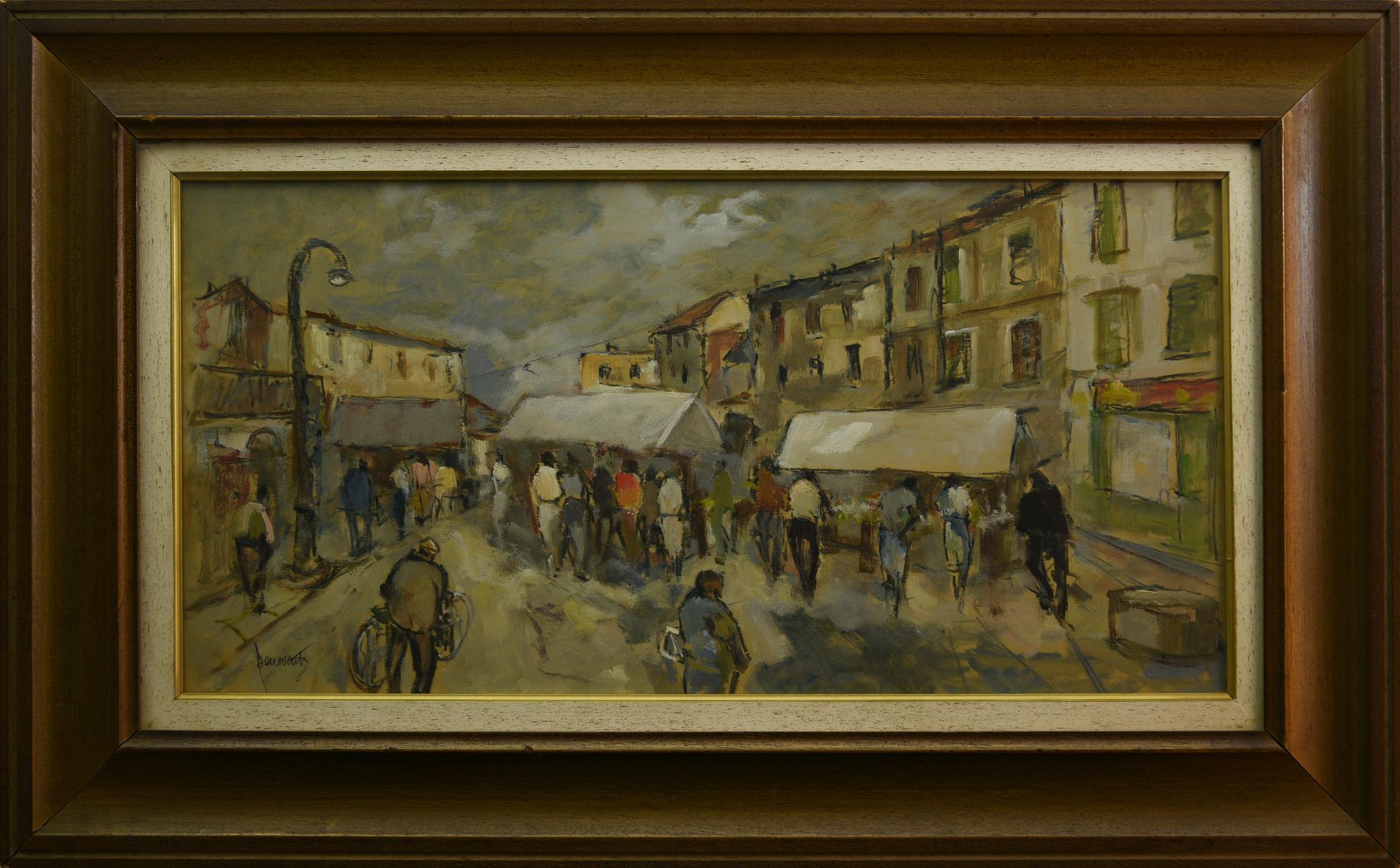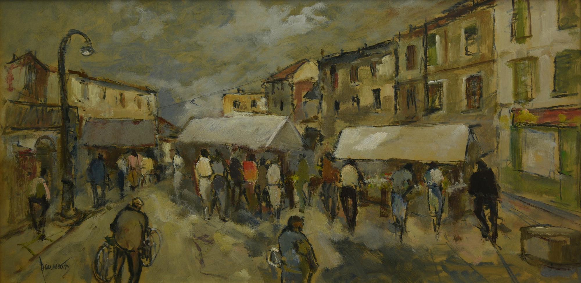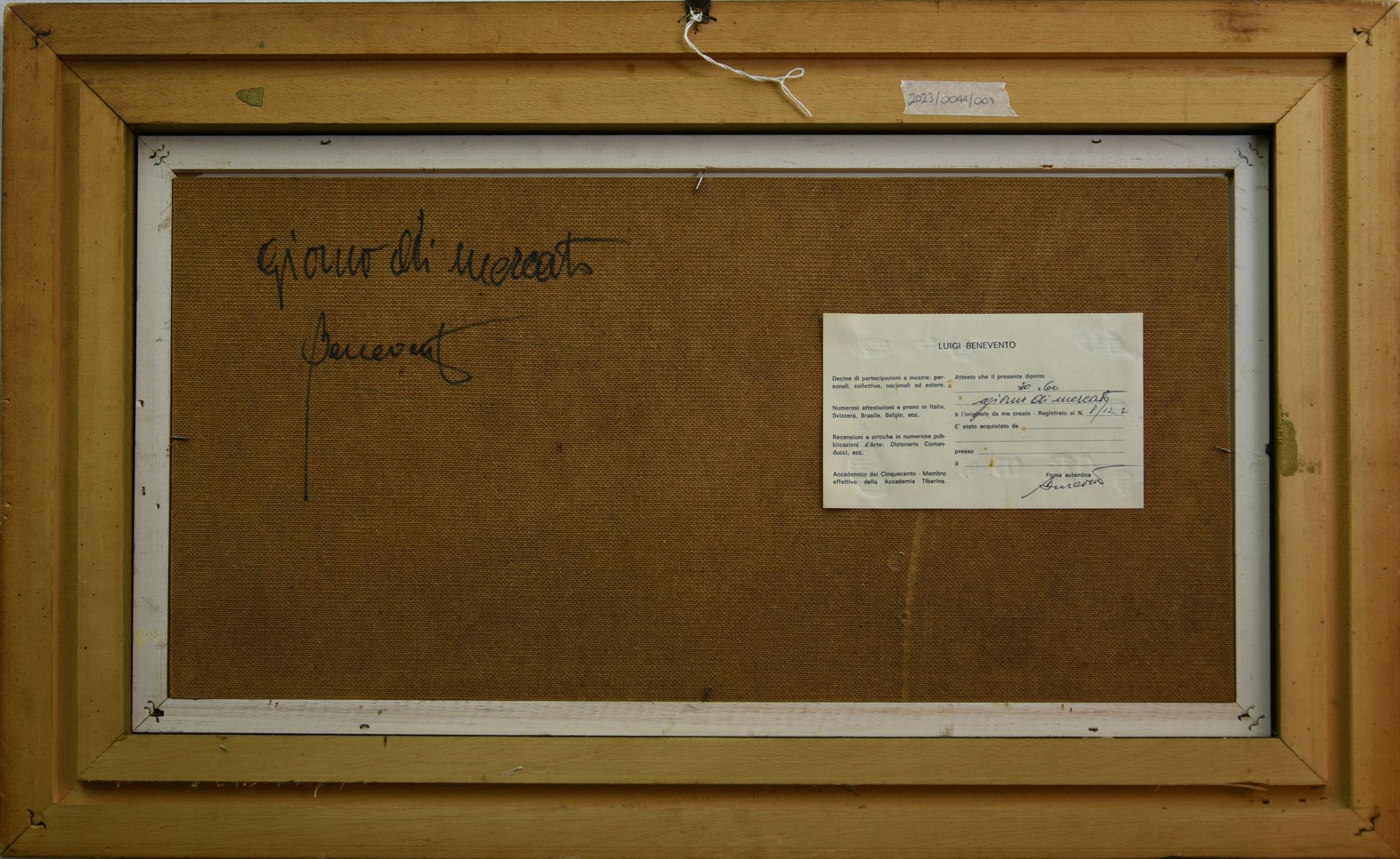 Luigi Benevento GIORNO DI MERCATO olio su faesite, cm 30x60 firma sul retro:...