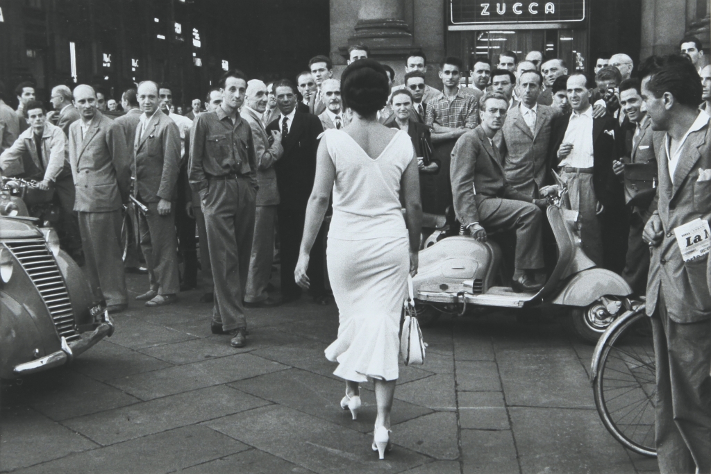 Emanuele II e un folto gruppo di uomini si voltano per guardarla. Uno di loro è a bordo di una Lambretta simbolo, insieme al bar Zucca, della Milano degli anni Cinquanta. Milano (Italia), 1954.