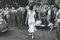 La giovanissima circense ed attrice Moira Orfei con abito bianco e di spalle, si dirige verso la Galleria Vittorio