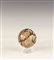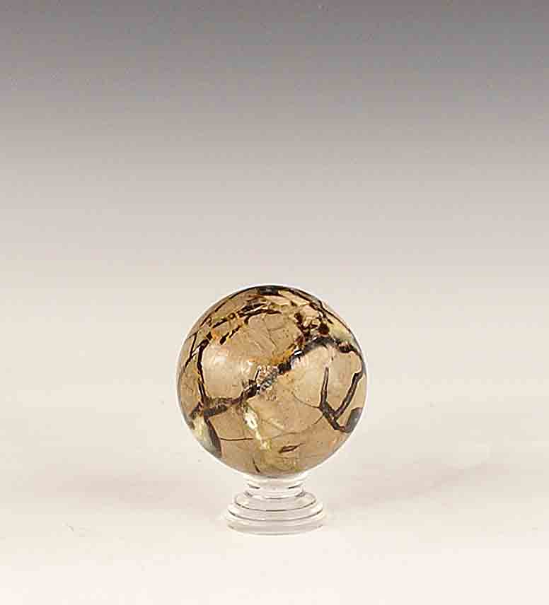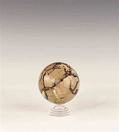 Sfera in pietra fossile, poggiante su base in plexiglass, h. cm. 15 .