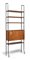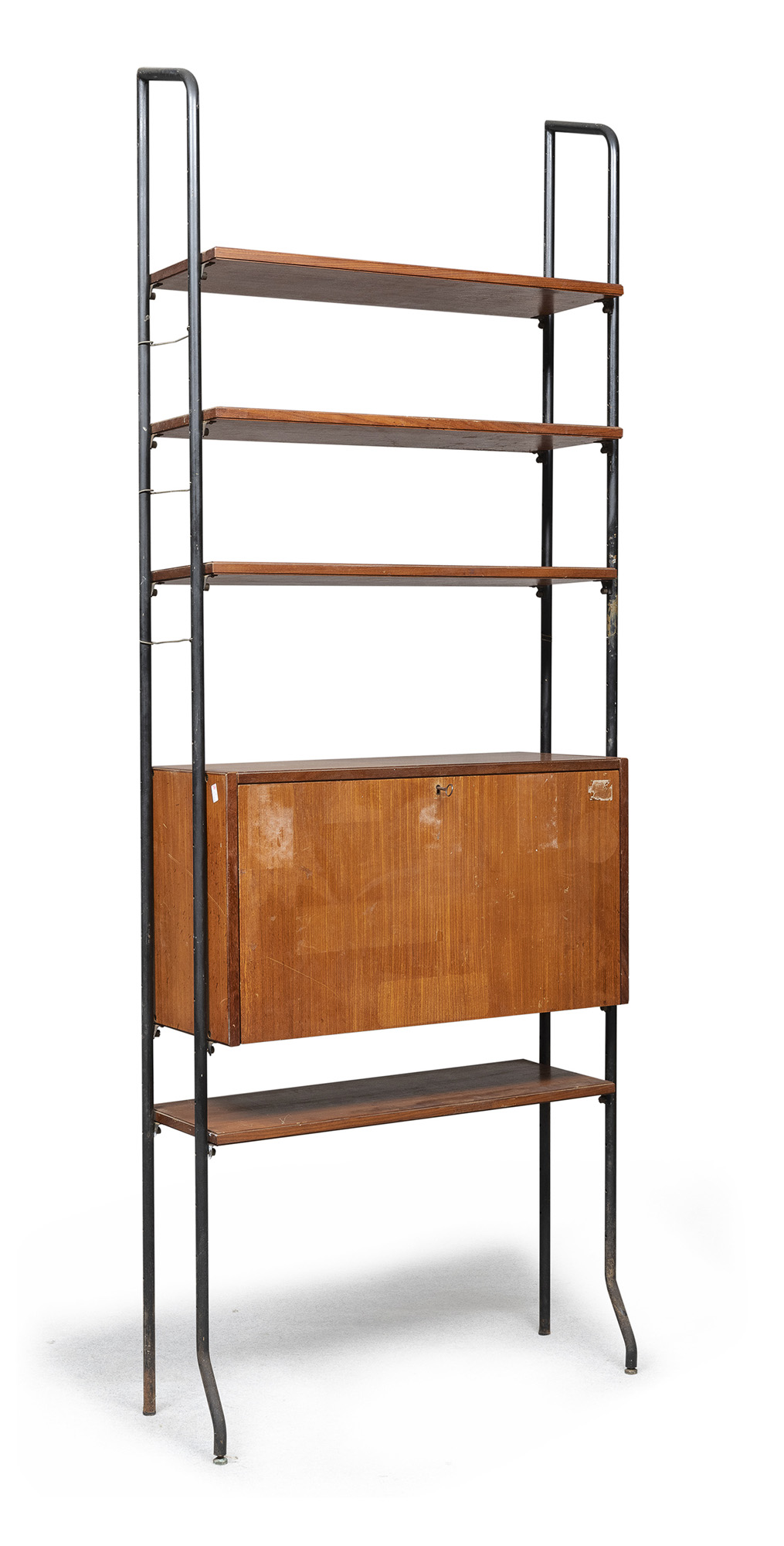 con fusto a tondino in metallo a lacca nera. Cinque ripiani e credenza modulare in tek con sportelli a scomparsa.