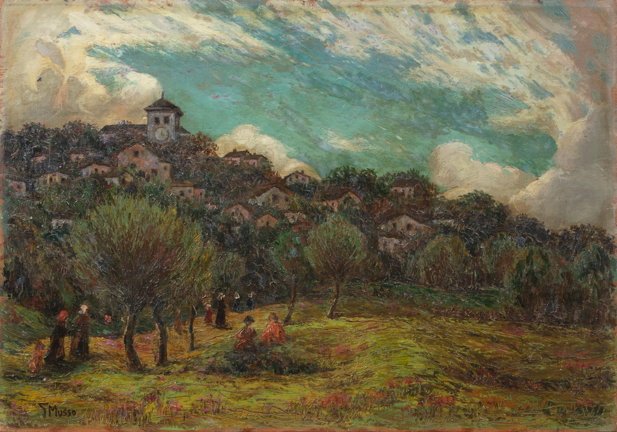 Musso (XIX-XX secolo) Paesaggio con figure Olio su compensato 35x50 cm Firmato
