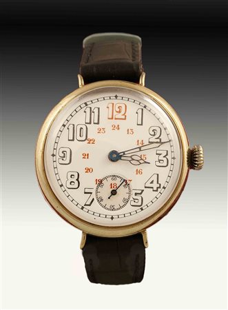 Orologio da polso in argento, cassa tonda, quadrante in porcellana con numeri arabi e contasecondi ore 6, movimento meccanico a carica manuale, cinturino in pelle, primi '900.