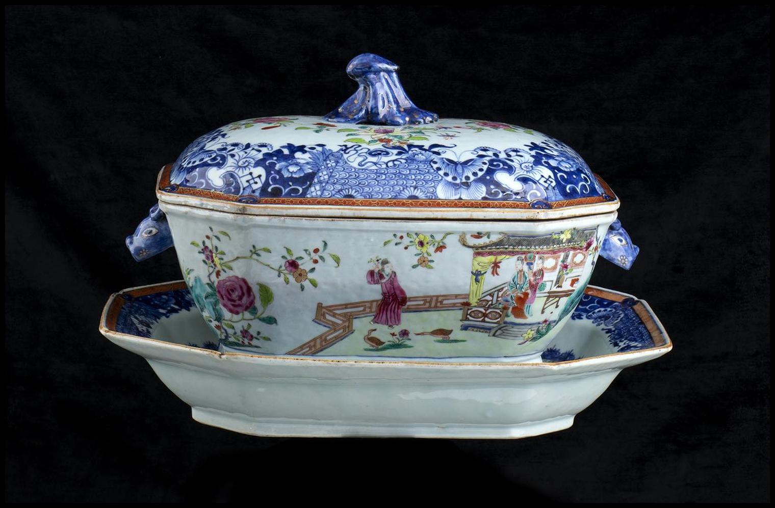 I pezzi a sezione ottagonale, il contenitore con prese modellate come testa di coniglio, il coperchio con presa a fiore stilizzato, la decorazione - dipinta in blu di cobalto sotto vetrina e smalti policromi della ‘Famiglia Rosa’ - consiste sul corpo di scene affollate di personaggi e ambientate tra giardini e scorci di architetture, sul coperchio fiori, farfalle e campiture geometriche.