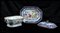 I pezzi a sezione ottagonale, il contenitore con prese modellate come testa di coniglio, il coperchio con presa a fiore stilizzato, la decorazione - dipinta in blu di cobalto sotto vetrina e smalti policromi della ‘Famiglia Rosa’ - consiste sul corpo di scene affollate di personaggi e ambientate tra giardini e scorci di architetture, sul coperchio fiori, farfalle e campiture geometriche.