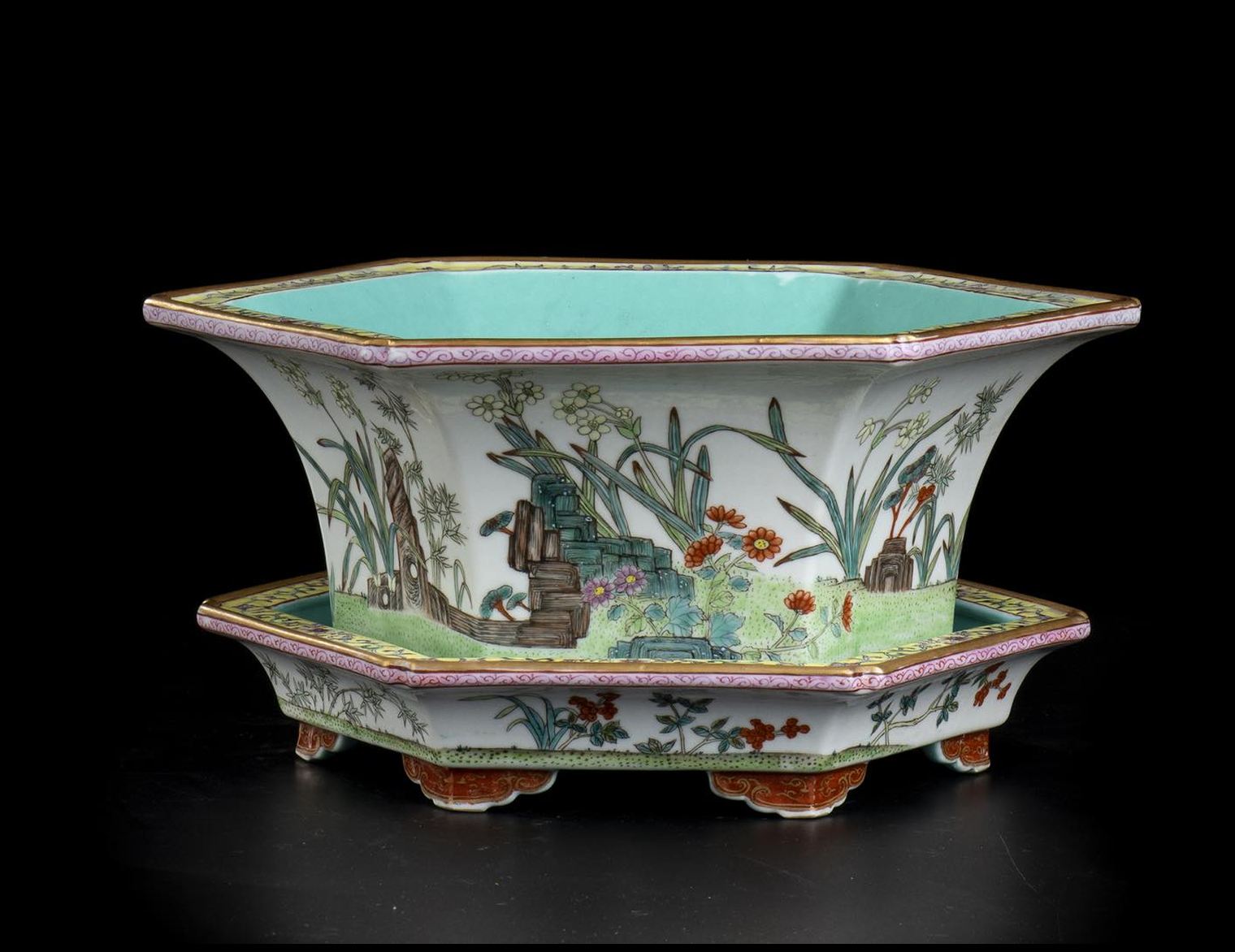 GIARDINIERA CON VASSOIO IN PORCELLANA CON DECORO A SMALTI POLICROMI Cina, XX secolo