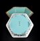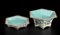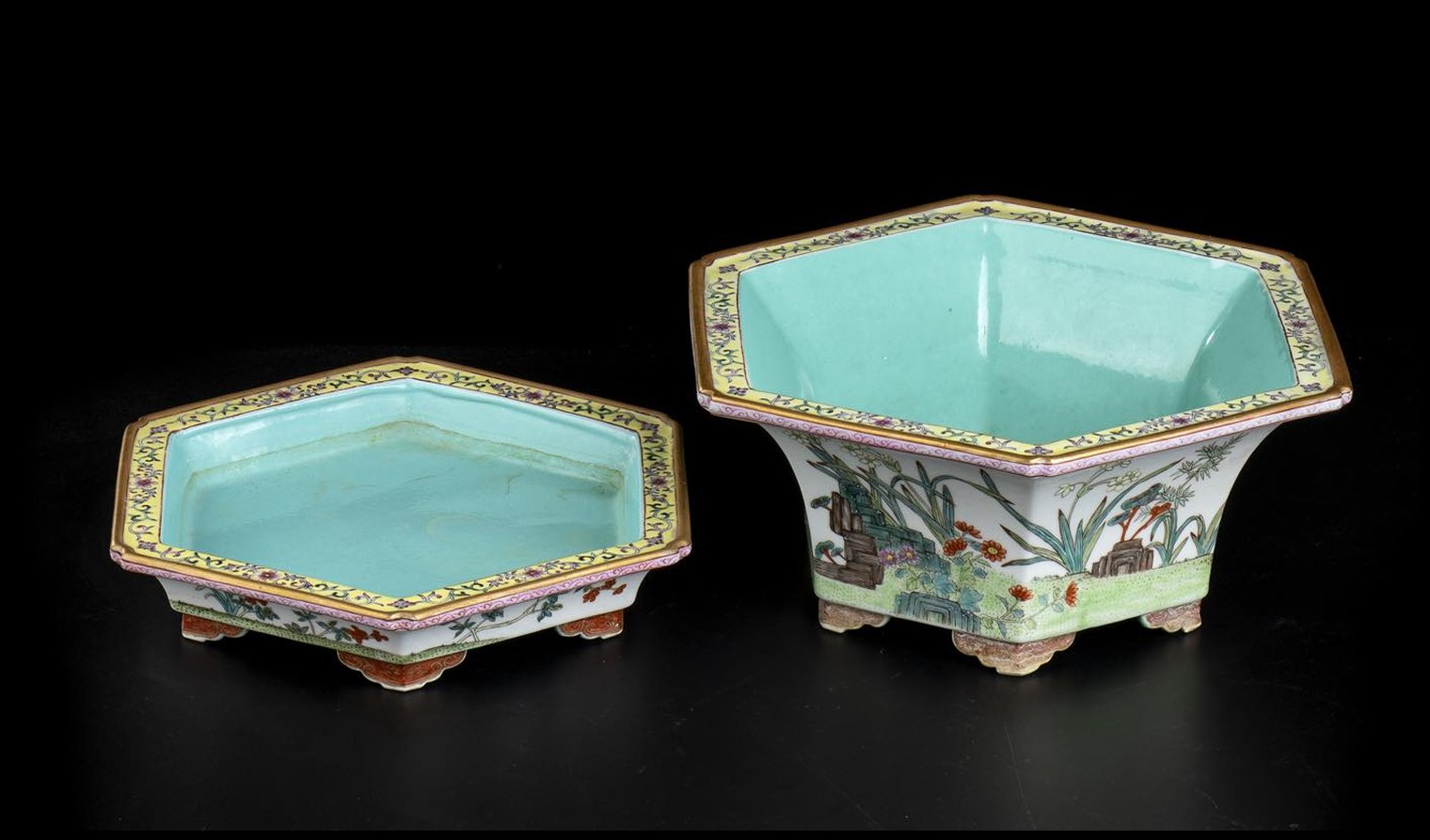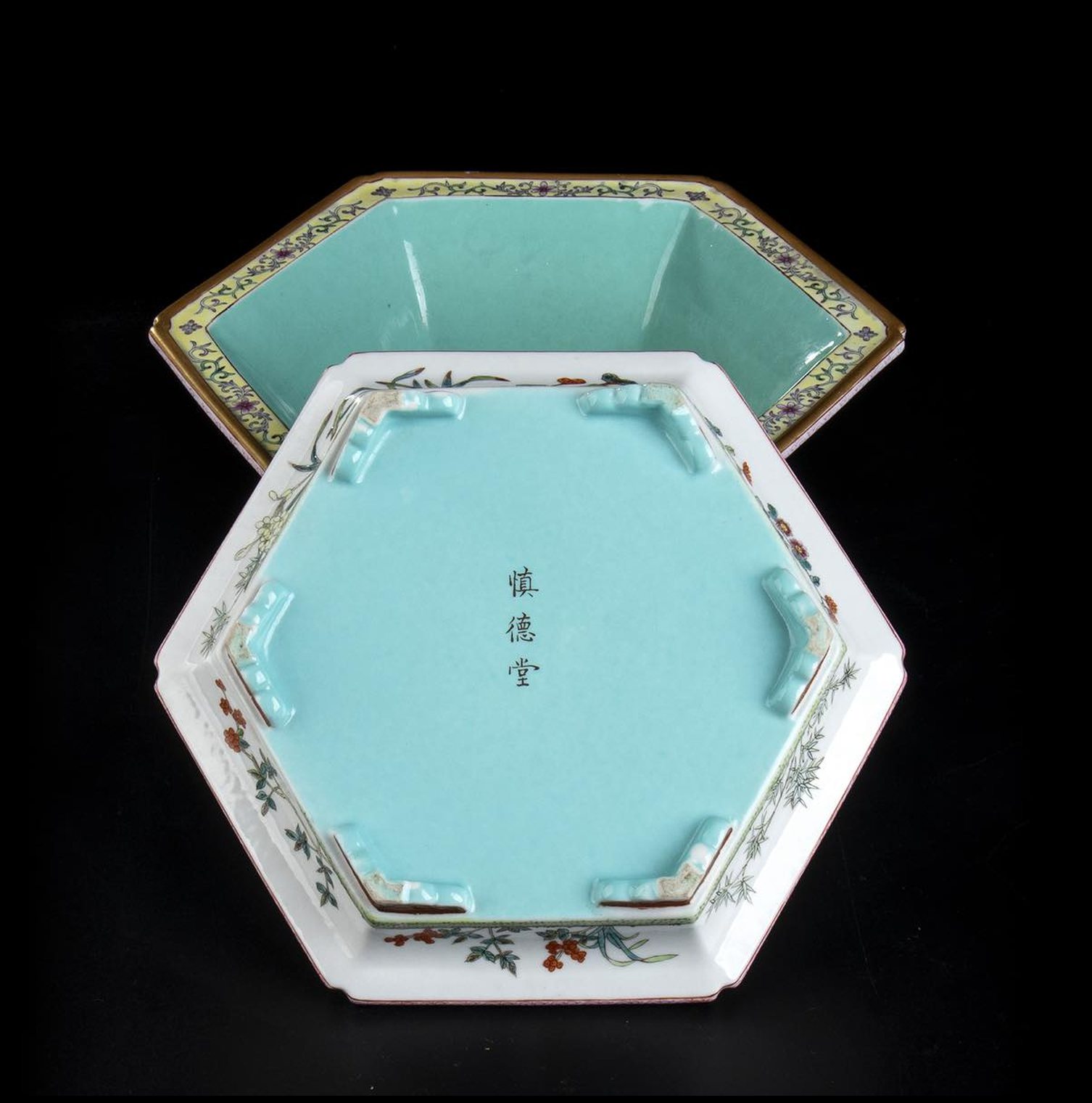 L'esterno delle pareti dei due pezzi decorato con composizioni di fiori e rocce, l'interno in turchese, marchio 慎徳堂 (Shendetang) al centro della base del vassoio.