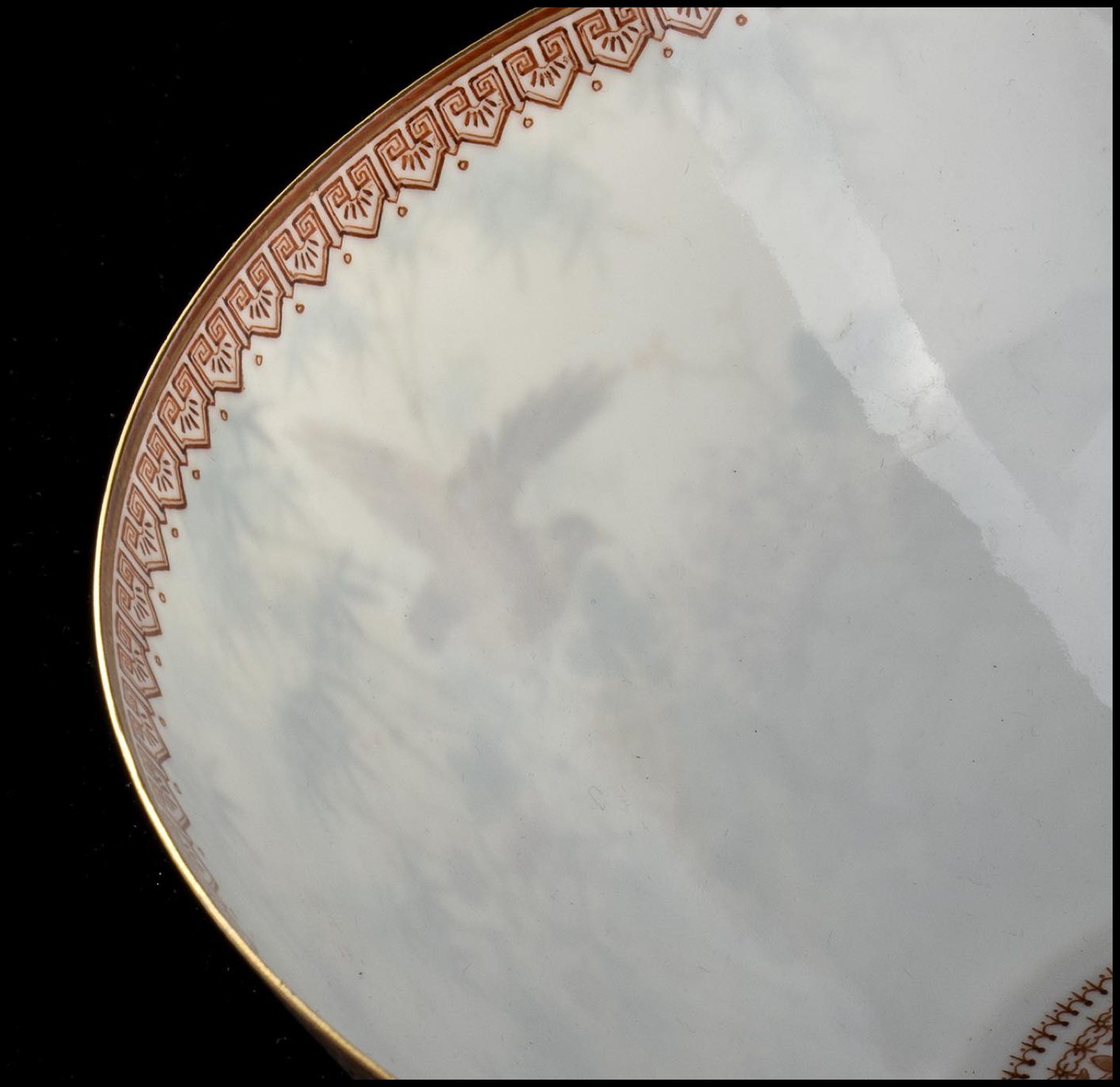 In porcellana finissima e leggerissima, la ciotola mostra sull'esterno una dettagliata decorazione di quaglie tra erbe e fiori alla quale si accompagna un'iscrizione con sigilli, marchio al centro della base.