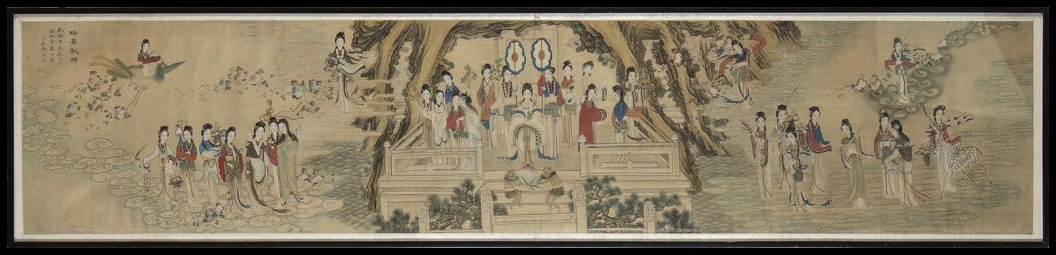 Il dipinto raffigura al centro Xiwangmu, la Regina Madre d'Occidente, su una terrazza attorniata da un folto stuolo di inservienti, altre divinità femminili del pantheon taoista si vedono nel resto della superficie pittorica, titolo, data e firma dell'artista con sigilli nell'angolo superiore sinistro, cornice in legno e vetro protettivo.