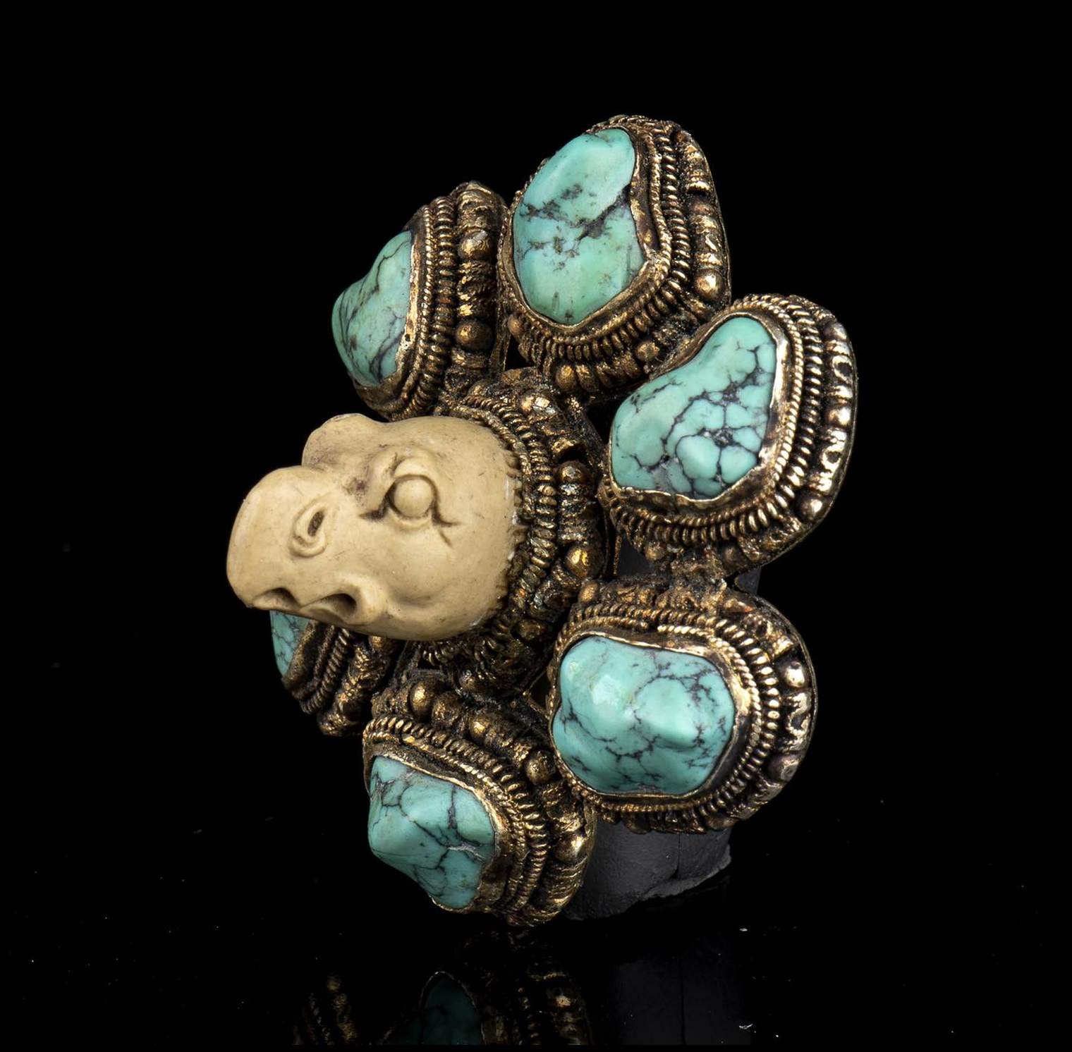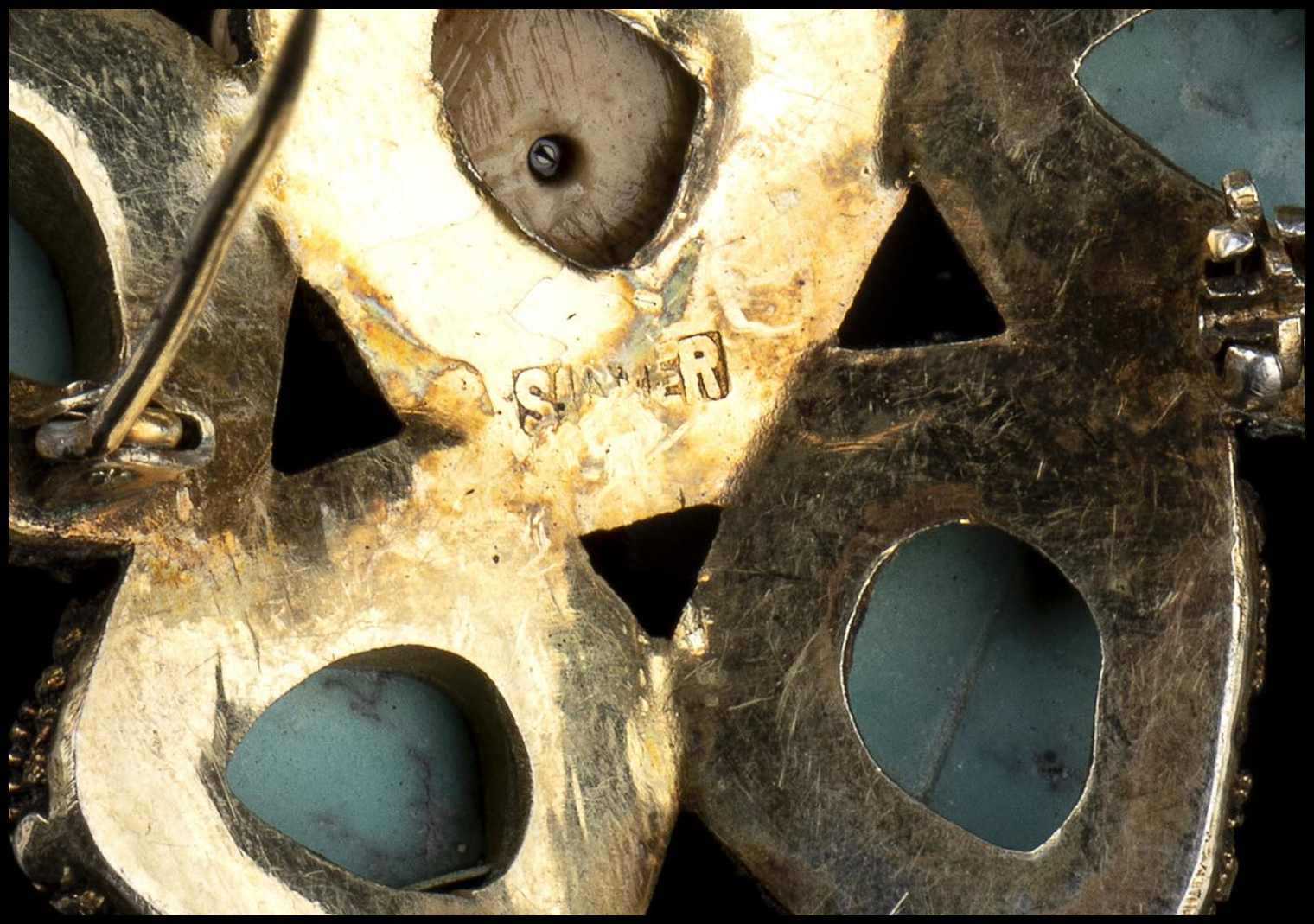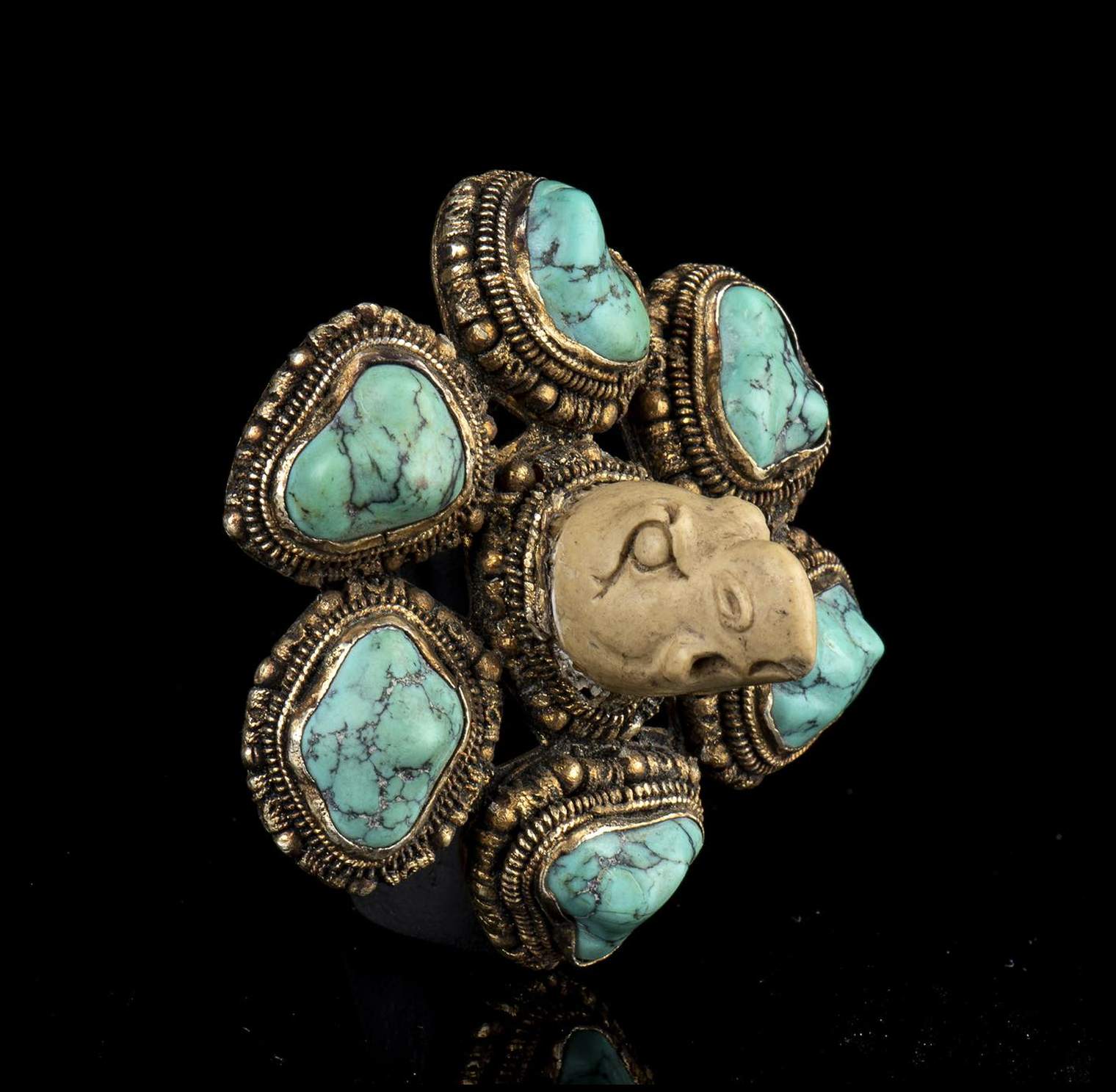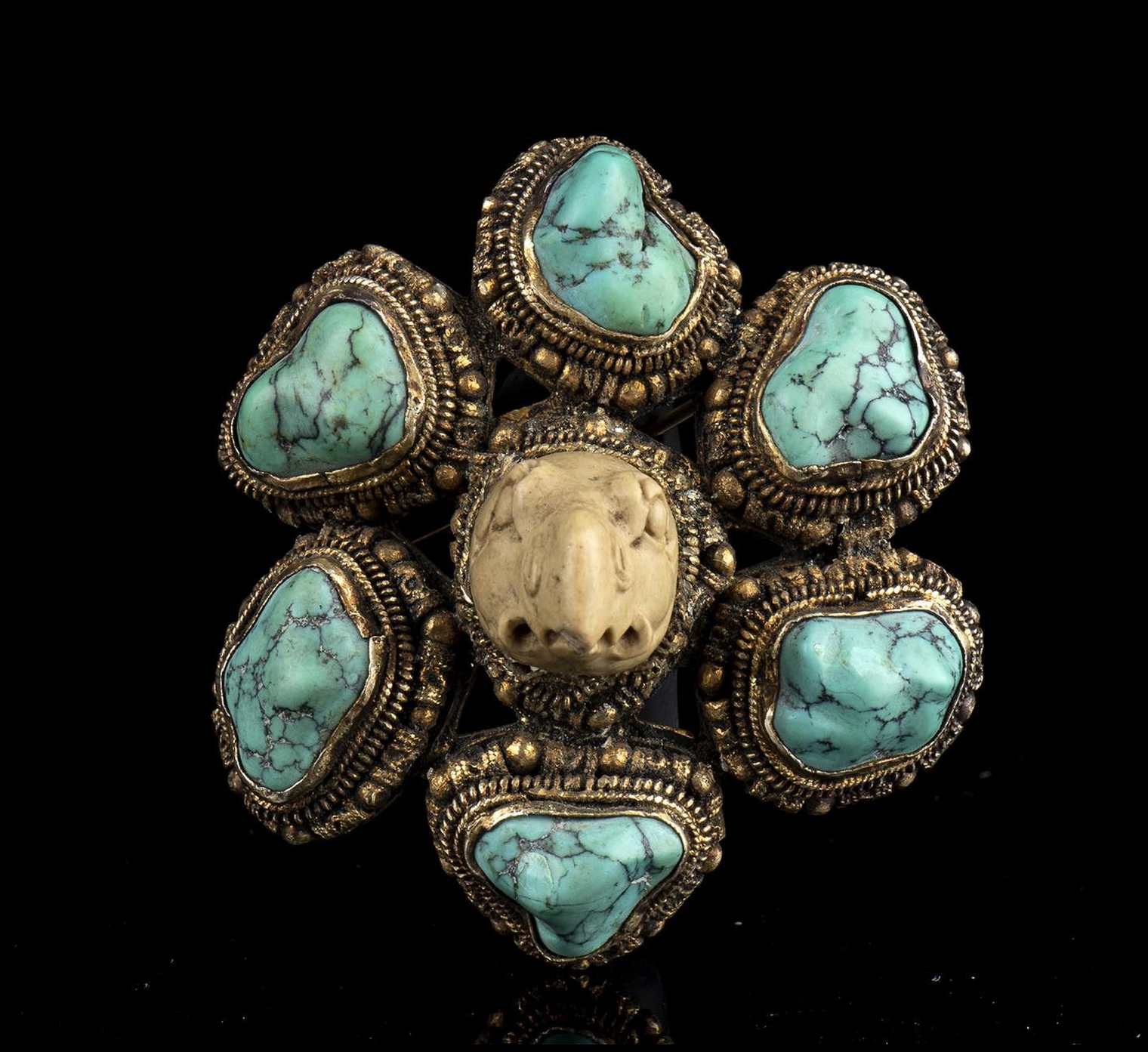 SPILLA IN METALLO CON INSERTI IN PIETRA E TURCHESI Cina, XX secolo