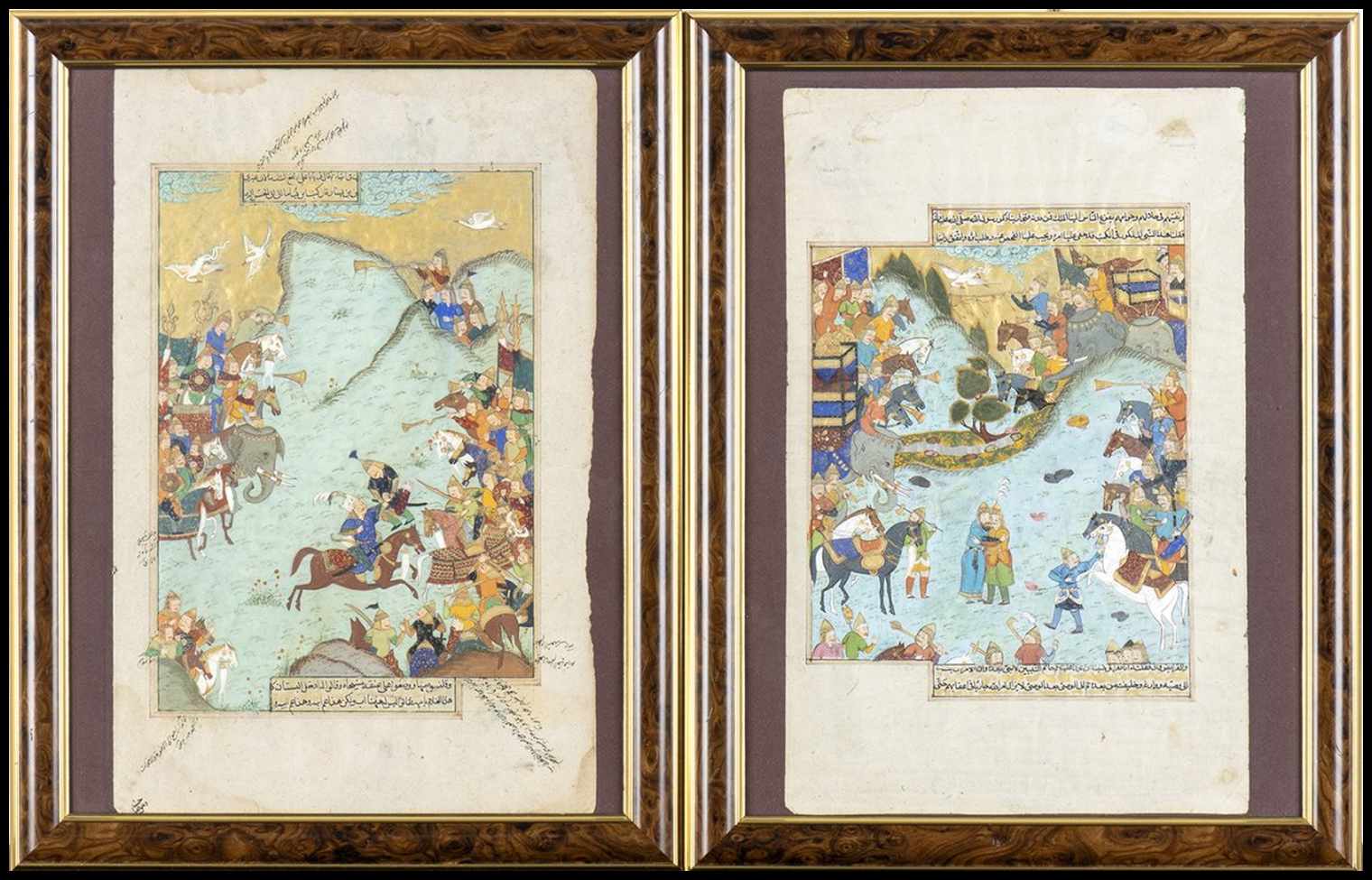 Finemente decorate a oro e policromia con scene di battaglia, cornice in legno e vetro protettivo (non esaminate al di fuori della cornice).