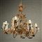 Firmato, datato. Lampadario otto bracci in ferro battuto a motivo floreale con gocce di vetro rosa a forma di fiore e gocce di cristallo sagomato. Inizi XX secolo. Mis. Lung. cm. 70 Alt. cm. 70 ca.