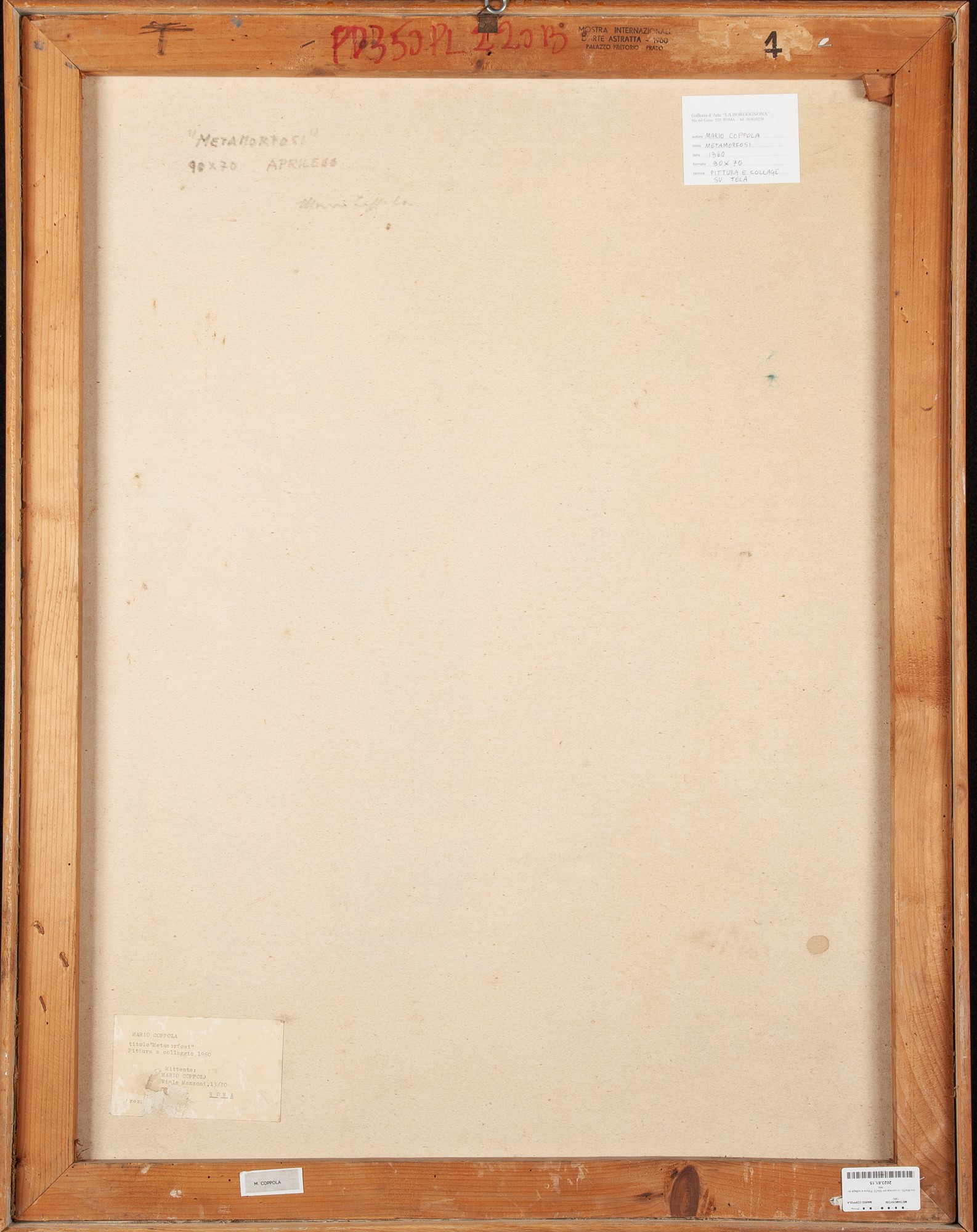Firma e data "Coppola '60".Al verso reca firma, titolo e data. Etichetta Galleria La Borgognona, Roma. Timbro Mostra Internazionale d'Arte Astratta, Palazzo Pretorio, Prato.