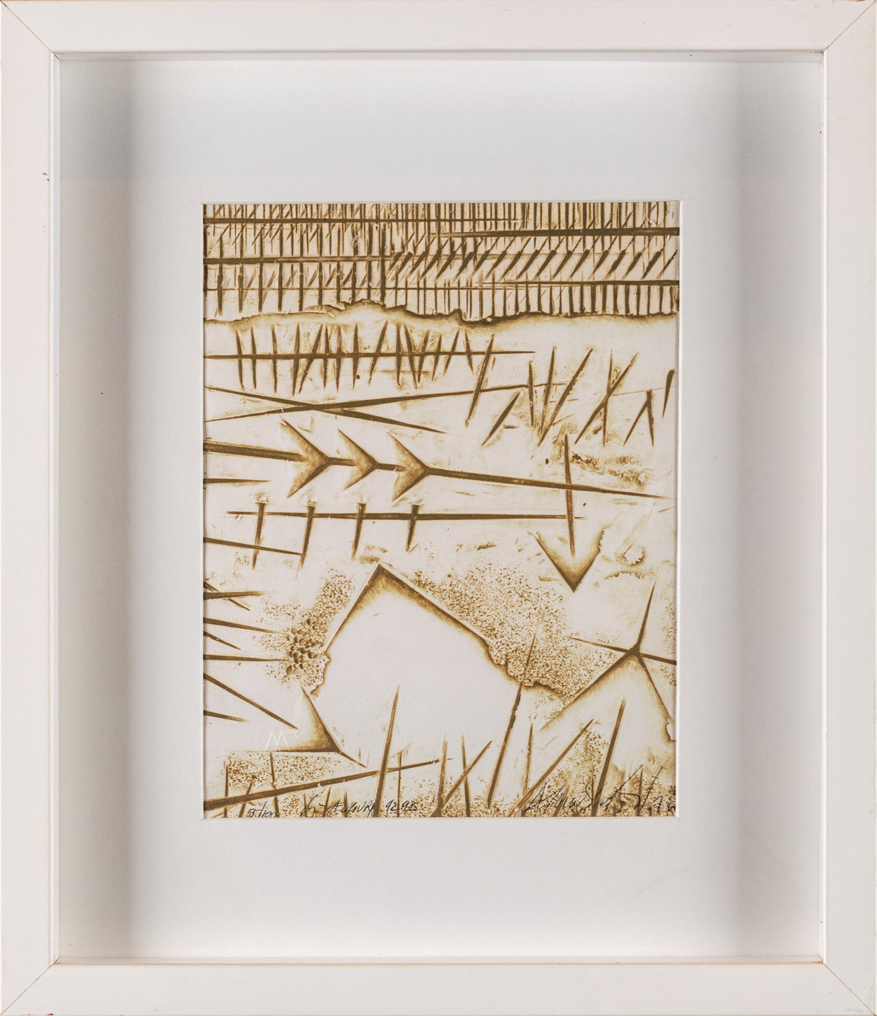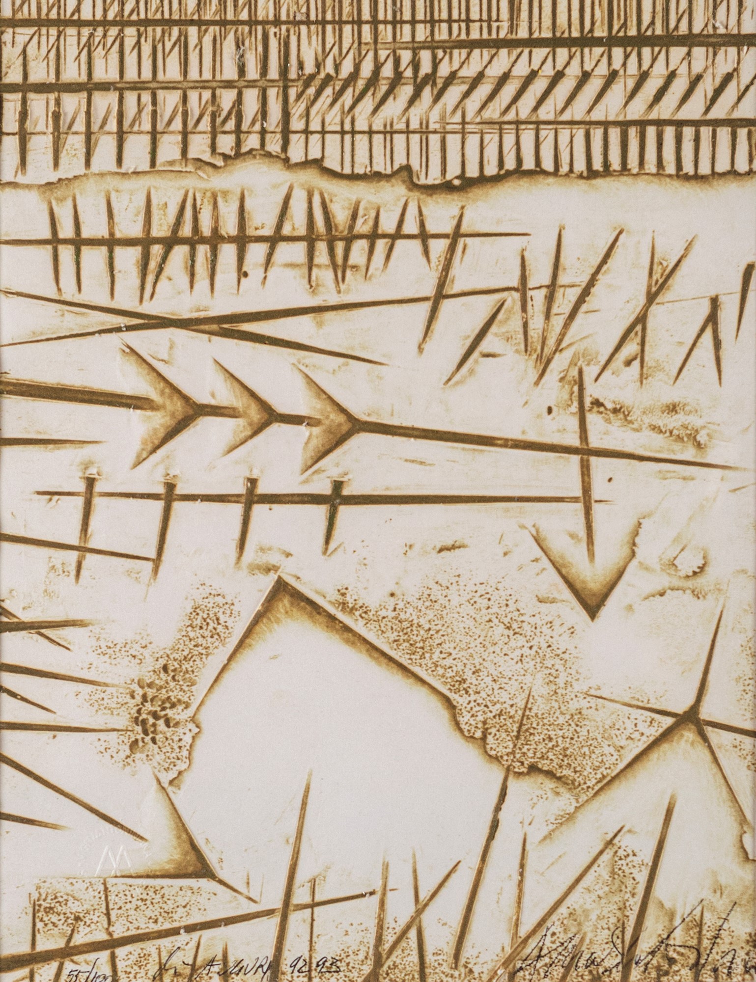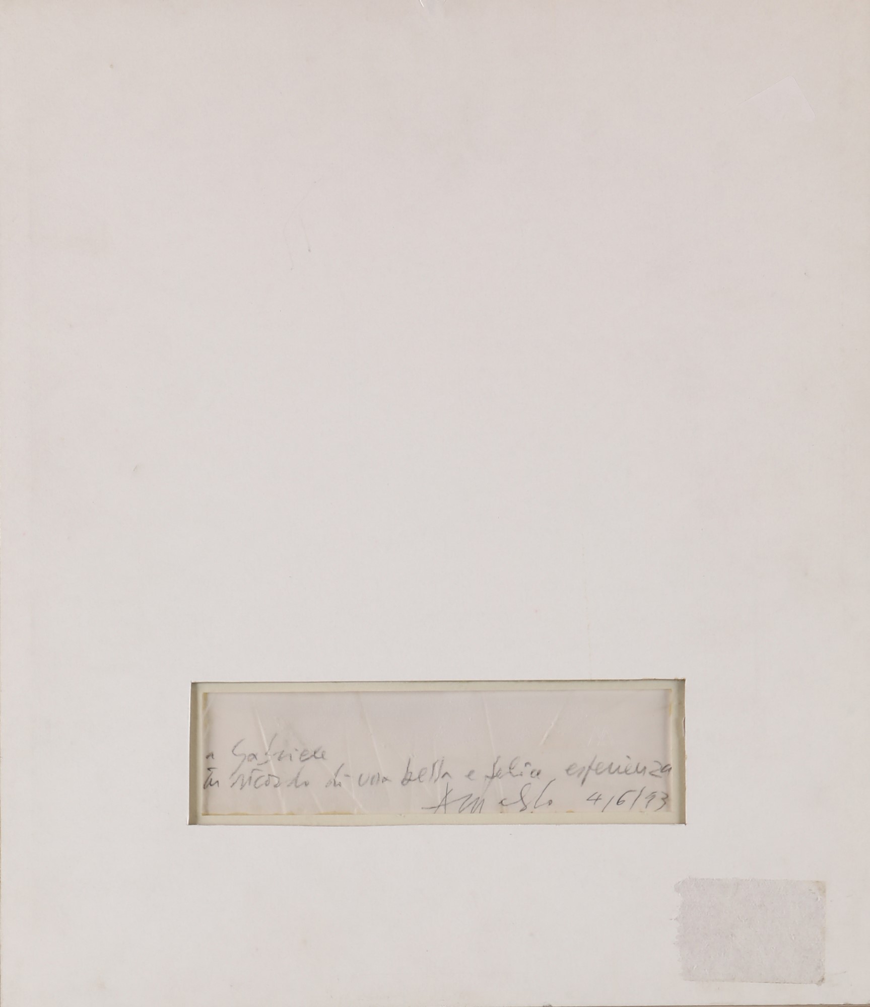 Firma, dedica e numerazione "Arnaldo Pomodoro, 55/100, Auguri '92-'93". Al verso reca dedica. Timbro a secco