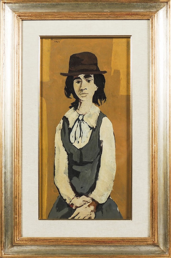 MARCELLO BOCCACCI (1914-1996) Donna seduta - Seated Woman olio su tavoletta - oil on panel firmato e datato 1950, al verso firmato, datato e titolato, in cornice cm 45x22 Al verso reca timbri "Cavour Galleria d'Arte Firenze" e "Galleria d'Arte Giotto Prato"