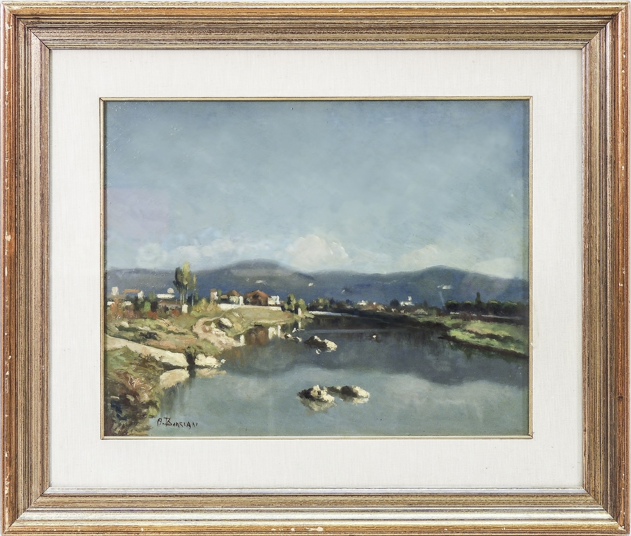 ALFREDO BONCIANI (1902-1988) Paesaggio fluviale - Landscape with a River olio su tavoletta - oil on panel, firmato, in cornice cm 40x50 Al verso reca cartigli di cui uno della "Società di Belle Arti Firenze" - With labels on reverse