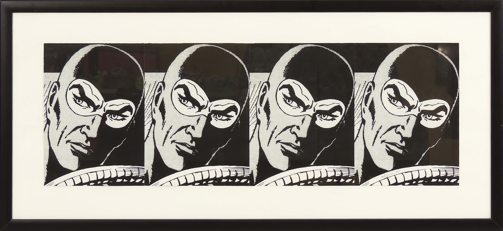 MALIPIERO Diabolik collage su cartoncino - collage on cardboard, firmato e datato 2004, in cornice cm 26x77