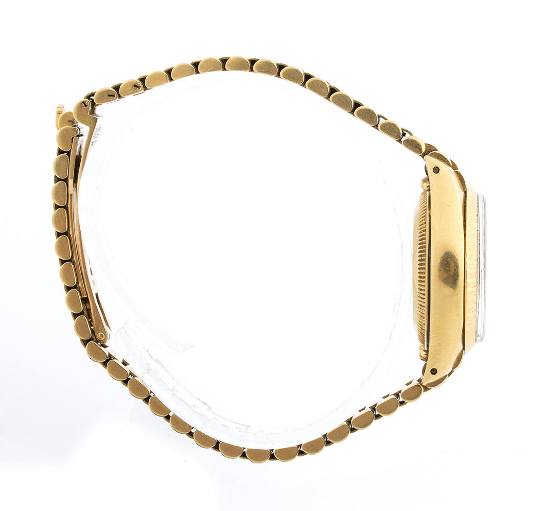 cassa in oro giallo 18k, quadrante champagne con indici a bastone firmato Oyster Perpetual. Movimento a carica automatica. Bracciale president.