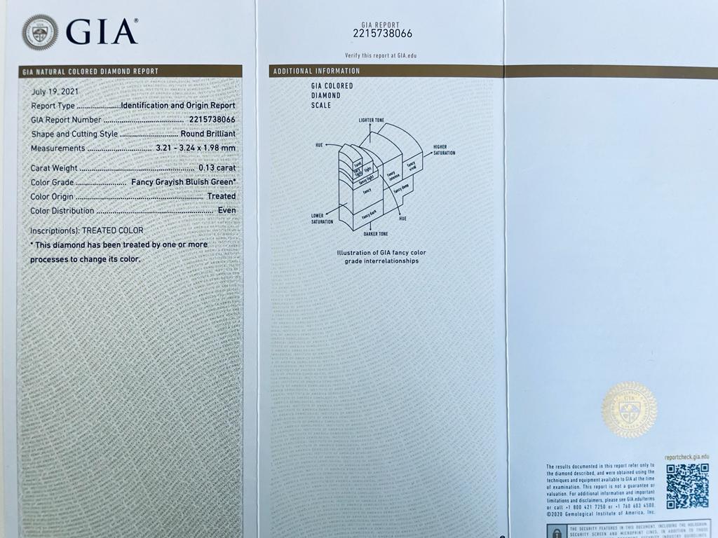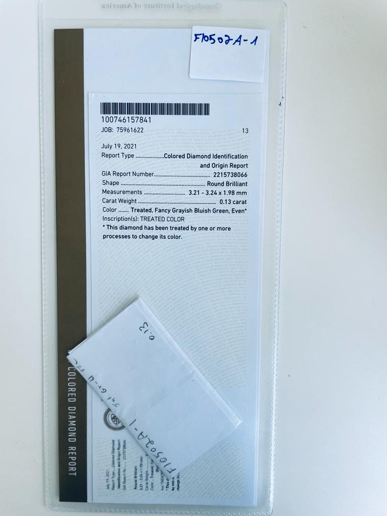 DIAMANTE COLORE ESALTATO 0,13 CT COLORE FANCY VERDE GRIGIO BLUASTRO UNIFORME - PUREZZA SI1 - TAGLIO BRILLANTE - CERTIFICATO GIA - F10502A-1