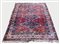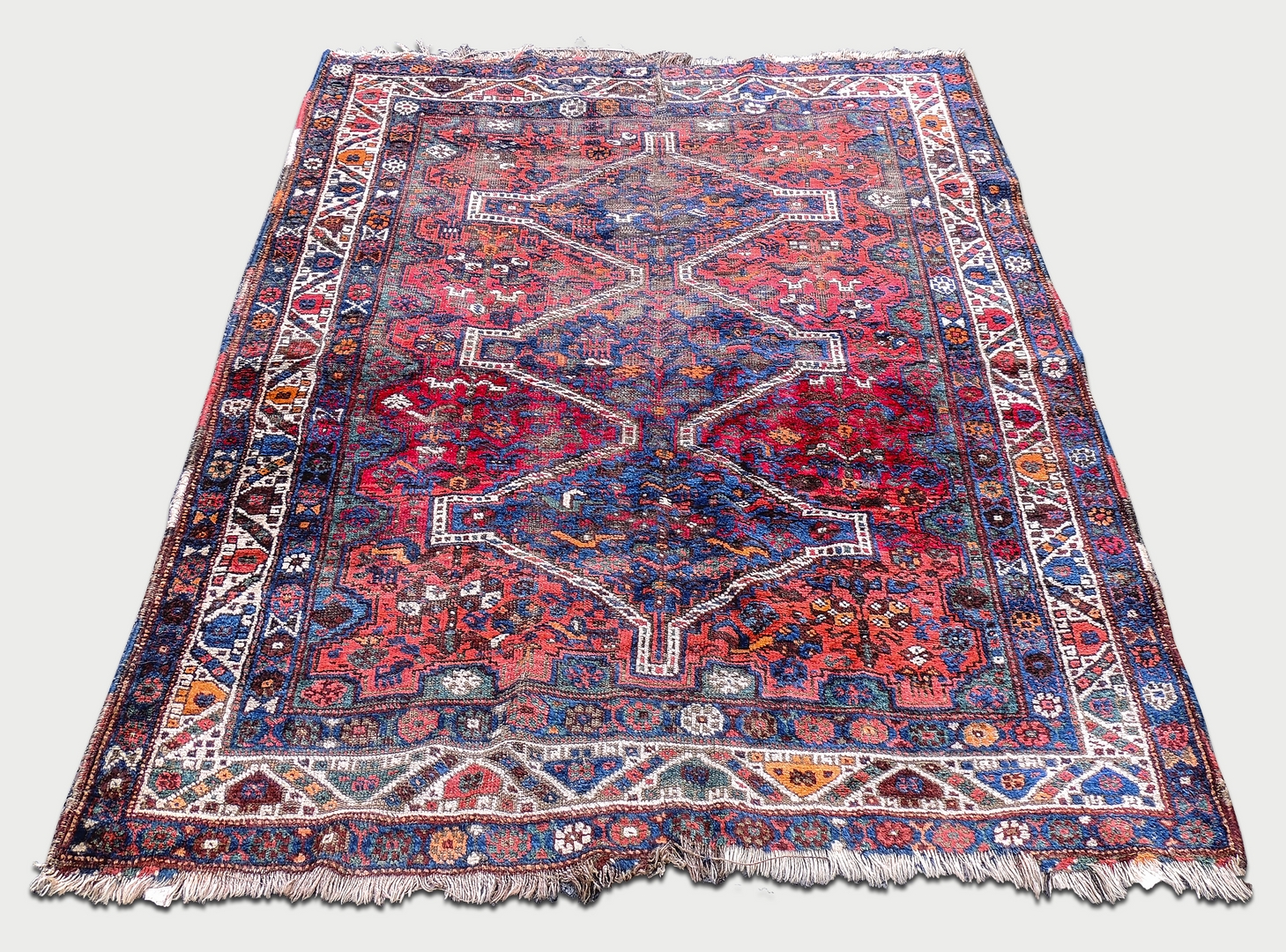 PICCOLO TAPPETO CAUCASICO - CAUCASIAN CARPET fondo blu, campo con tre medaglioni e motivi geometrici nei toni del rosso, beige, e giallo, difetti cm 190x165