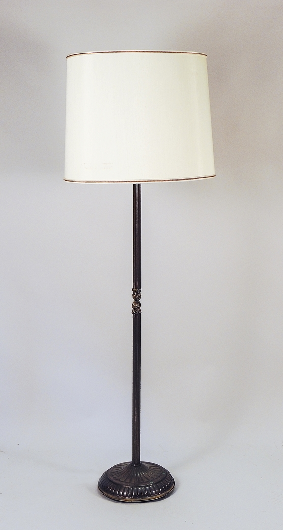 PIANTANA DA LETTURA IN OTTONE - BRASS FLOOR LAMP prima metà del XX secolo - first half of 20th Century fusto scanalato con al centro motivo di foglie, base circolare baccellata, corredata di paralume h cm 158