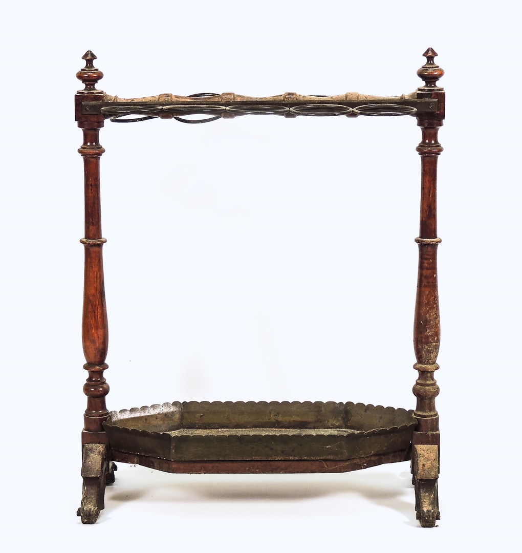 PORTAOMBRELLI IN NOCE E METALLO - WALNUT AND METAL UMBRELLA STAND fine XIX/inizio XX secolo - late 19th/early 20th Century sostegni torniti con piedini a doppia voluta h cm 77x60x28