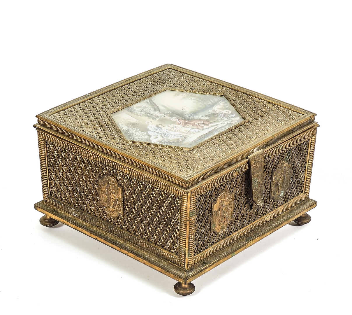 COFANETTO PORTAGIOIE IN METALLO DORATO - GILT METAL JEWEL BOX inizio del XX secolo - early 20th Century miniatura dipinta con scena galante sul coperchio e formelle sbalzate con Venere e Amore sui lati, difetti h cm 16x26x26