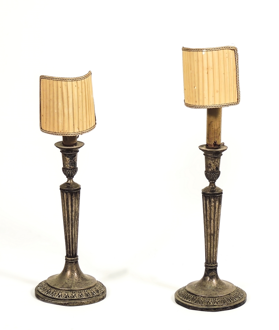 COPPIA DI CANDELIERI IN ARGENTO - PAIR OF SILVER CANDLEHOLDERS CONVERTED TO LAMPS XIX secolo - 19th Century fusto scanalato, base circolare sbalzata a palmette, montati a lume, alcuni difetti