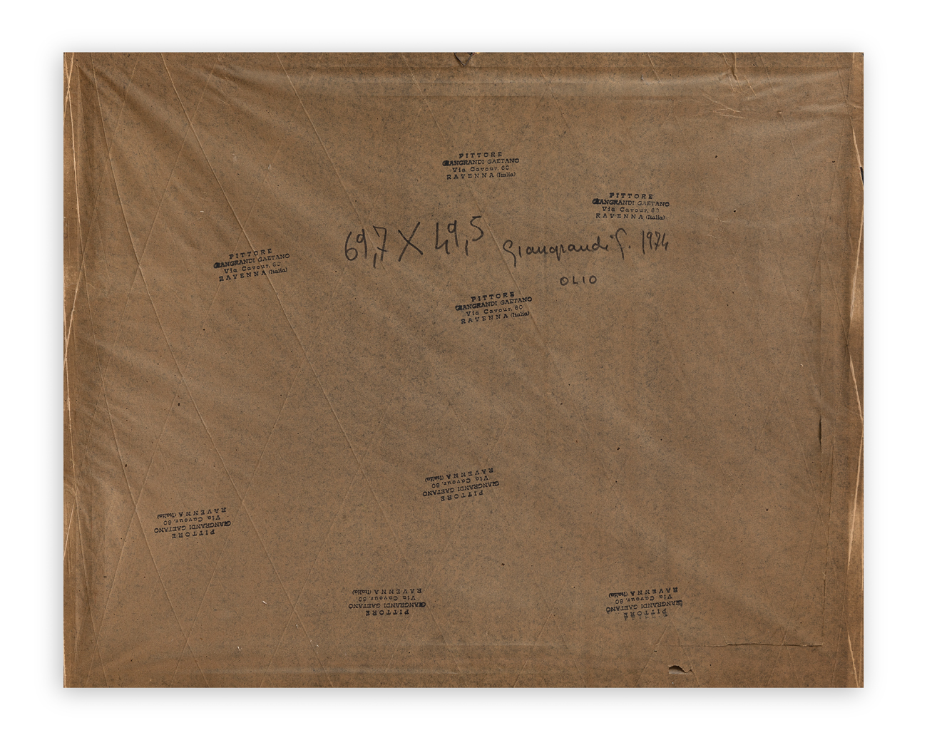 Firma, datazione, misure, tecnica e timbri dell'Artista al retro del cartone protettivo